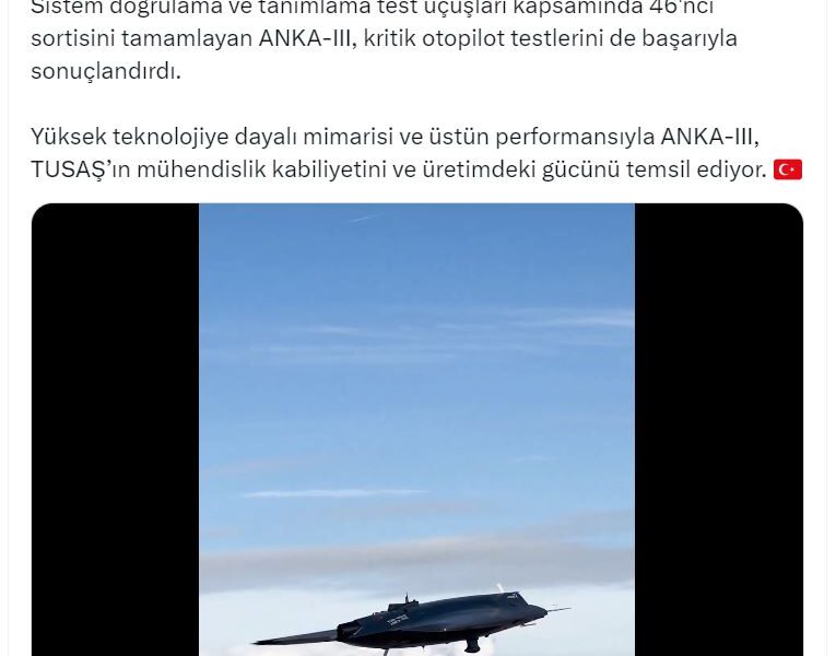 TUSAŞın sosyal medya hesabında ANKA-3ün test uçuşlarından görüntüler paylaşılarak, “ANKA-3, geliştirme sürecinde önemli bir eşiği daha geride bıraktı. Sistem doğrulama ve tanımlama test uçuşları kapsamında 46ncı sortisini tamamlayan ANKA-3, kritik otopilot testlerini de başarıyla sonuçlandırdı. Yüksek teknolojiye dayalı mimarisi ve üstün performansıyla ANKA-3, TUSAŞın mühendislik kabiliyetini ve üretimdeki gücünü temsil ediyor” denildi.