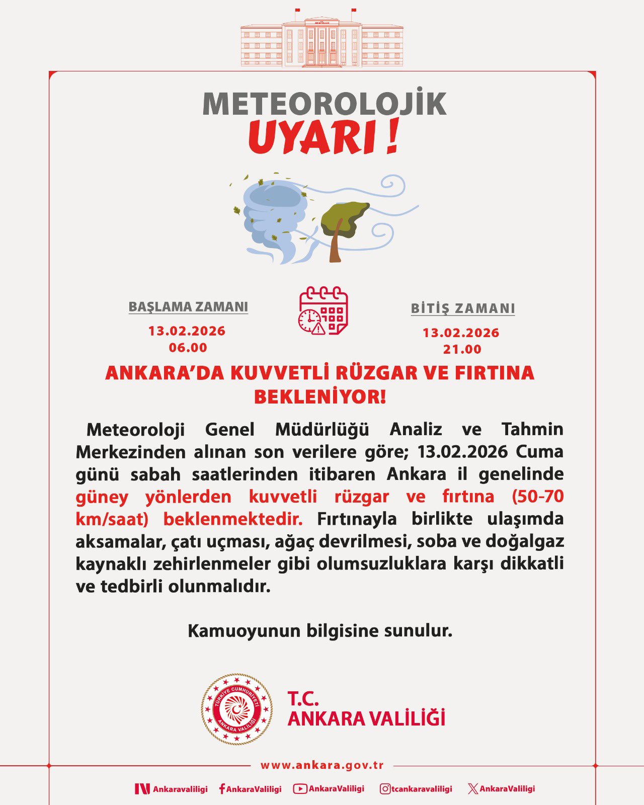 Ankara Valiliğinin sanal medya hesabından yapılan açıklamada, “Meteoroloji Genel Müdürlüğü Analiz ve Tahmin Merkezinden alınan son verilere göre; 13 Şubat 2026 Cuma günü sabah saatlerinden itibaren Ankara il genelinde güney yönlerden kuvvetli rüzgar ve fırtına (50-70 kilometre/saat) beklenmektedir. Fırtınayla birlikte ulaşımda aksamalar, çatı uçması, ağaç devrilmesi, soba ve doğal gaz kaynaklı zehirlenmeler gibi olumsuzluklara karşı dikkatli ve tedbirli olunmalıdır” denildi.