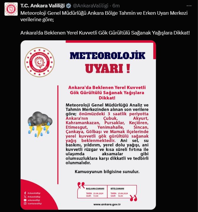 Valiliğin sosyal medya hesabından yapılan açıklamada, “Meteoroloji Genel Müdürlüğü Analiz ve Tahmin Merkezinden alınan son verilere göre; önümüzdeki 3 saatlik periyotta Ankaranın Çubuk, Akyurt, Kahramankazan, Pursaklar, Keçiören, Etimesgut, Yenimahalle, Sincan, Çankaya, Gölbaşı ve Mamak ilçelerinde yerel kuvvetli gök gürültülü sağanak yağış beklenmektedir. Ani sel, su baskını, yıldırım, yerel dolu yağışı, ani kuvvetli rüzgar ve kısa süreli fırtına ile ulaşımda aksamalar gibi olumsuzluklara karşı dikkatli ve tedbirli olunmalıdır” denildi.