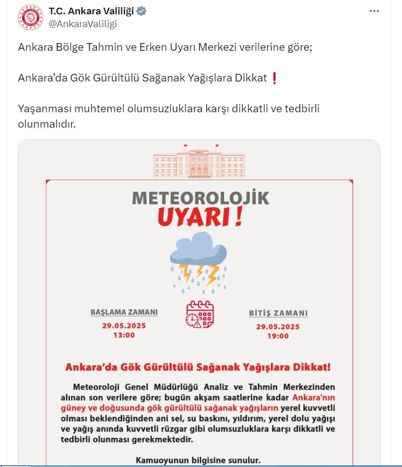 Valiliğin sosyal medya hesabından yapılan açıklamada, “Meteoroloji Genel Müdürlüğü Analiz ve Tahmin Merkezinden alınan son verilere göre; bugün akşam saatlerine kadar Ankaranın güney ve doğusunda gök gürültülü sağanak yağışların yerel kuvvetli olması beklendiğinden ani sel, su baskını, yıldırım, yerel dolu yağışı ve yağış anında kuvvetli rüzgar gibi olumsuzluklara karşı dikkatli ve tedbirli olunması gerekmektedir” denildi. Gök gürültülü sağanağın saat 13.00 ile 19.00 arasında etkili olmasının beklendiği belirtildi.