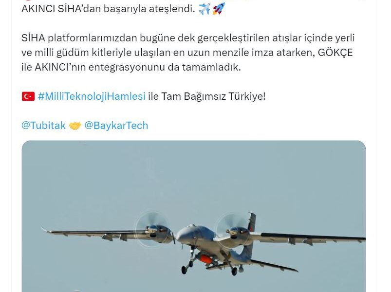 Bakan Kacır, sosyal medya hesabından yaptığı açıklamada, “TÜBİTAK SAGE tarafından geliştirilen GÖKÇE Yeni Nesil Güdüm Kiti, AKINCI SİHAdan başarıyla ateşlendi. SİHA platformlarımızdan bugüne dek gerçekleştirilen atışlar içinde yerli ve milli güdüm kitleriyle ulaşılan en uzun menzile imza atarken, GÖKÇE ile AKINCI’nın entegrasyonunu da tamamladık. Milli teknoloji hamlesi ile tam bağımsız Türkiye” ifadelerini kullandı.