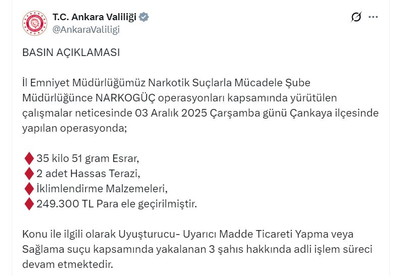 Valiliğin sosyal medya hesabından yapılan açıklamada, “İl Emniyet Müdürlüğümüz Narkotik Suçlarla Mücadele Şube Müdürlüğünce Narkogüç operasyonları kapsamında, yürütülen çalışmalar neticesinde 3 Aralık 2025 Çarşamba günü Çankaya ilçesinde yapılan operasyonda; 35 kilo 51 gram esrar, 2 hassas terazi, iklimlendirme malzemeleri, 249 bin 300 TL para ele geçirilmiştir. Konuyla ilgili olarak Uyuşturucu- uyarıcı madde ticareti yapma veya sağlama suçu kapsamında yakalanan 3 şahıs hakkında adli işlem süreci devam etmektedir” denildi.