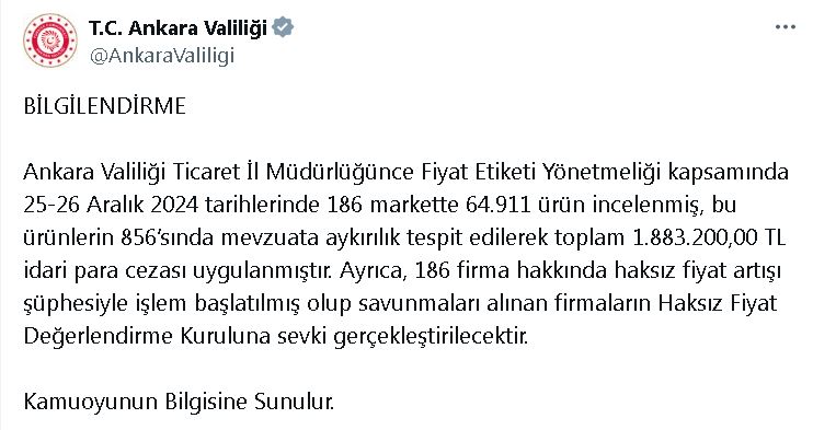 Valiliğin sosyal medya hesabından yapılan açıklamada, “Ankara Valiliği Ticaret İl Müdürlüğünce Fiyat Etiketi Yönetmeliği kapsamında 25-26 Aralık 2024 tarihlerinde 186 markette 64 bin 911 ürün incelenmiş, bu ürünlerin 856sında mevzuata aykırılık tespit edilerek toplam 1 milyon 883 bin 200 TL idari para cezası uygulanmıştır. Ayrıca, 186 firma hakkında haksız fiyat artışı şüphesiyle işlem başlatılmış olup savunmaları alınan firmaların Haksız Fiyat Değerlendirme Kuruluna sevki gerçekleştirilecektir” denildi.