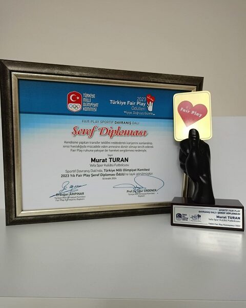 Futbolcu Murat Turan, siroz hastalığıyla mücadele eden annesi Fatma Turan’a (52) donör olup, karaciğeri ile yaşama tutunmasını sağlamıştı. Donör olabileceğini öğrendikten bir gün önce başka bir kulüpten transfer teklifi alan 28 yaşındaki futbolcu, annesine büyük bir vefa örneği göstererek kariyerinden vazgeçmişti. Bunun üzerine Turana, TMOK tarafından Fair Play Sportif Davranış Dalı kapsamında Şeref Diploması Ödülü verildi. Diplomada “Kendisine yapılan transfer teklifini reddederek kariyerini sonlandırıp siroz hastalığıyla mücadele eden annesine donör olmayı tercih ederek Fair Play ruhuna yakışan bir hareket sergilemesi nedeniyle sayın Murat Turan’a Sportif Davranış Dalı’nda, Türkiye Milli Olimpiyat Komitesi 2023 Yılı Fair Play Şeref Diploması Ödülü’ne layık görülmüştür” yazısı yer aldı.