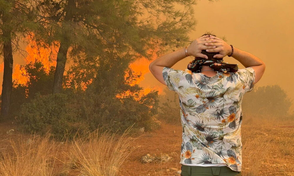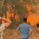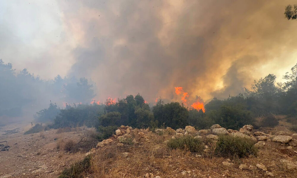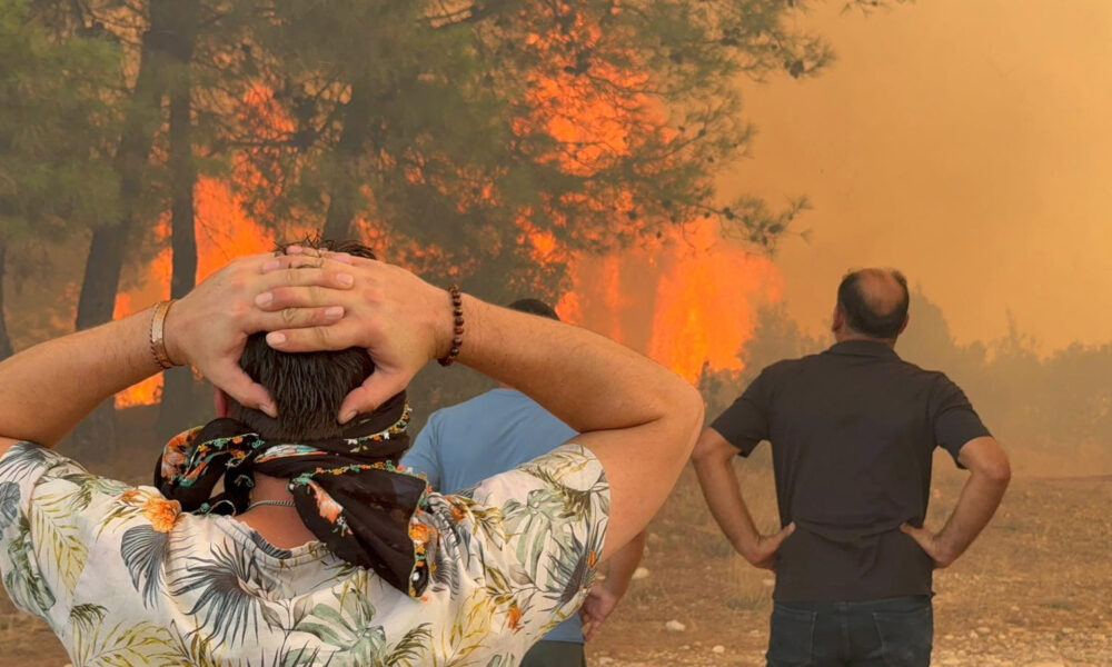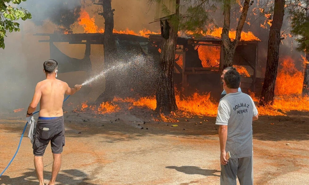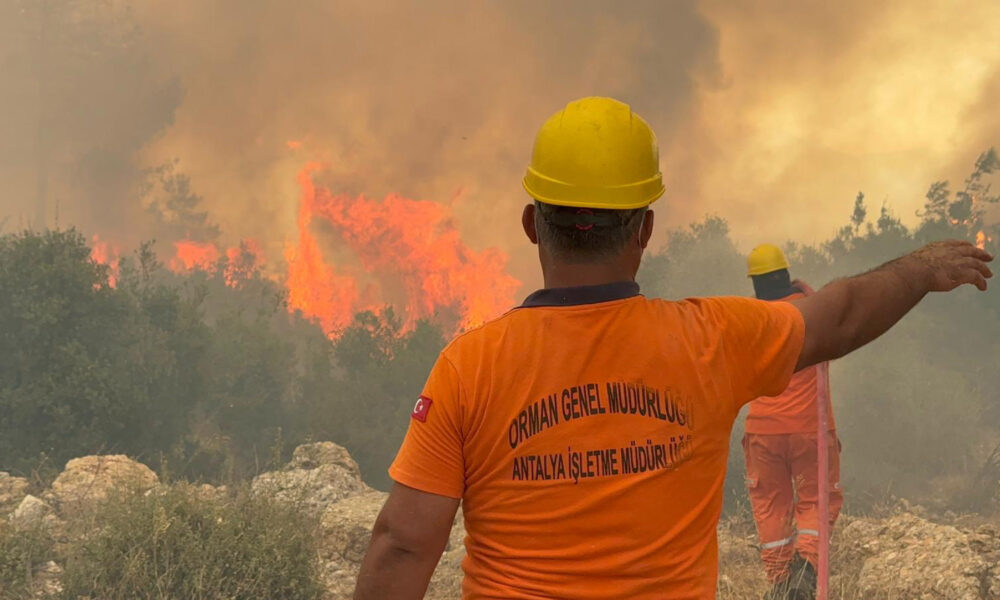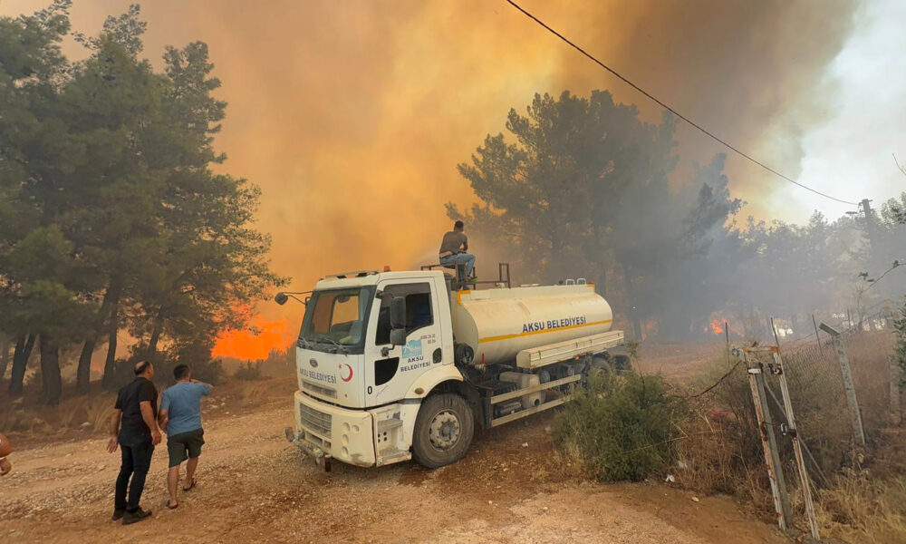 Antalya'nın Aksu ilçesi Kurşunlu Mahallesi'ndeki orman yangınına karadan ve havadan müdahale ediliyor. Fotoğraf: Adem AKALAN/Antalya, (DHA)