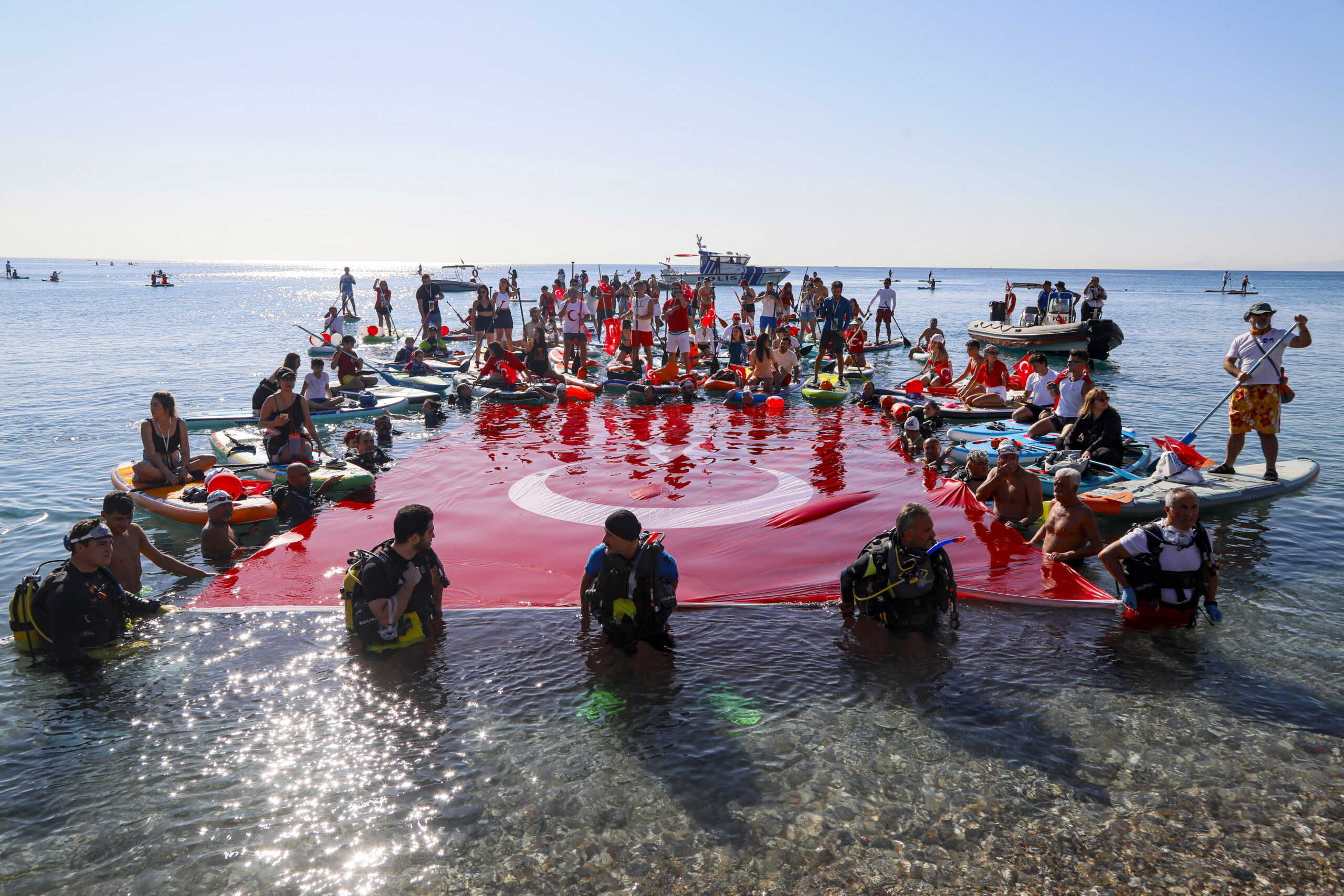 Saygı duruşu ve İstiklal Marşının okunmasının ardından marşlar eşliğinde Türkiye Cumhuriyetinin kuruluşunun 101inci yılı coşkuyla kutlandı. Organizasyonu düzenleyen Dalgıç Alim Tuğ, “Bir grup dalgıç arkadaşımız 2,5 kilometre yüzdü. Denizde Türk bayrağını açtık. Denizin altında ve üstünde bayramı coşkuyla kutladık. Bu bizim bayramımız. Dünya var oldukça burada olacağımızın mesajıydı” dedi.