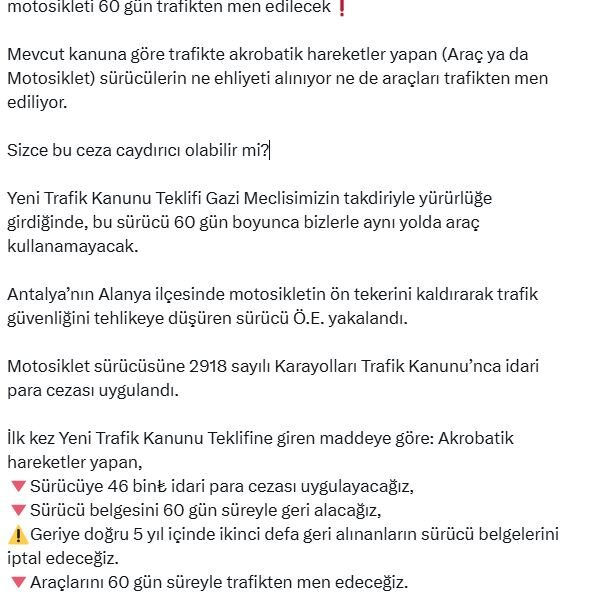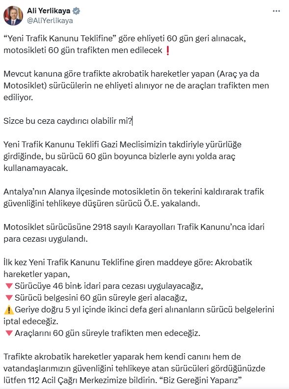 Bakan Ali Yerlikaya, Antalyanın Alanya ilçesinde motosikletin ön tekerleğini kaldıran sürücünün görüntülerini sosyal medya hesabından paylaşarak, “Mevcut kanuna göre trafikte akrobatik hareketler yapan (Araç ya da Motosiklet) sürücülerin ne ehliyeti alınıyor ne de araçları trafikten menediliyor. Sizce bu ceza caydırıcı olabilir mi? Yeni Trafik Kanunu Teklifi Gazi Meclisimizin takdiriyle yürürlüğe girdiğinde, bu sürücü 60 gün boyunca bizlerle aynı yolda araç kullanamayacak” dedi.
