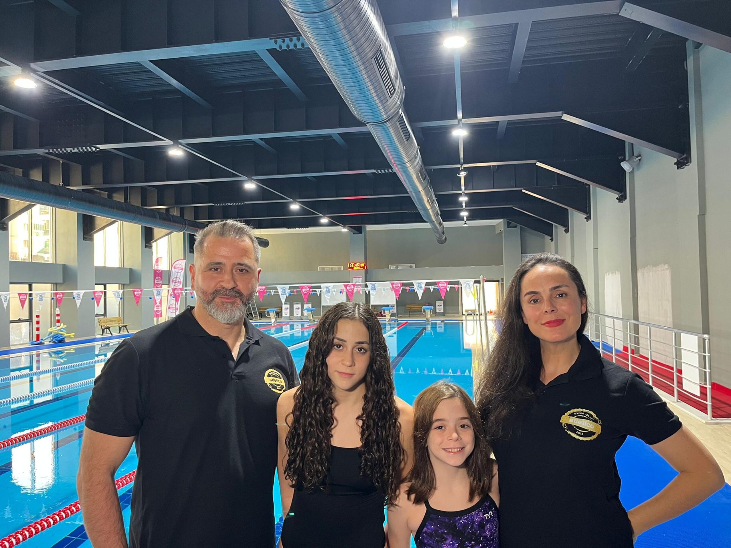 • İzmirli milli yüzücü Barış Arslan'ın (Solda) kızları Jasmin (Soldan ikinci) ve Juliet (Sağdan ikinci), küçük yaşta başladıkları yüzme sporunda dikkat çeken başarılara imza atıyor. Yasemin Arslan (Sağda). Fotoğraf: Yağmur ÖNGÜN/İzmir,(DHA)