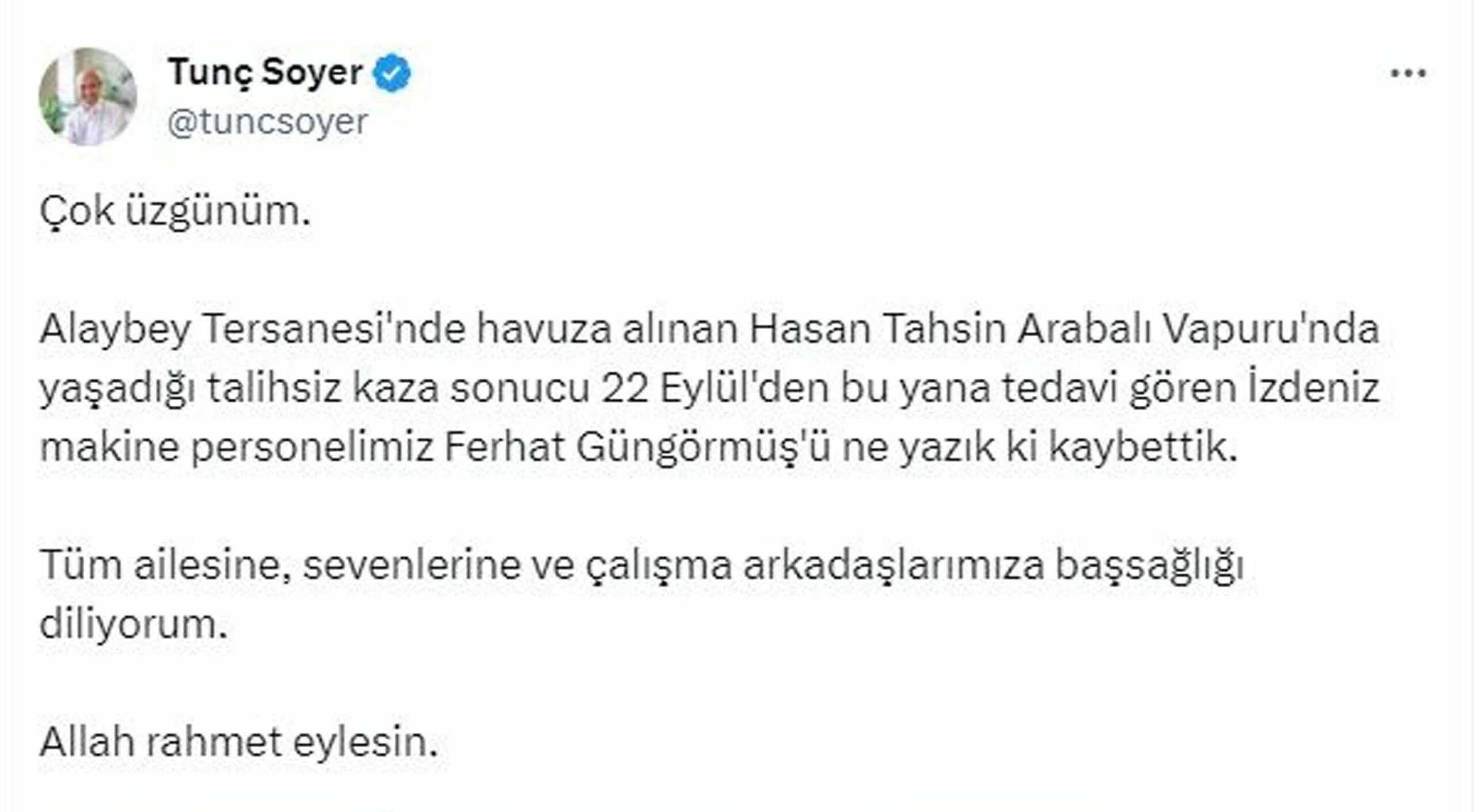 Sosyal medyadan açıklamada bulunan Büyükşehir Belediye Başkanı Tunç Soyer, “Çok üzgünüm. Alaybey Tersanesi’nde havuza alınan Hasan Tahsin Arabalı Vapuru’nda yaşadığı talihsiz kaza sonucu, 22 Eylül’den bu yana tedavi gören İZDENİZ makine personelimiz Ferhat Güngörmüş’ü, ne yazık ki kaybettik. Tüm ailesine, sevenlerine ve çalışma arkadaşlarımıza başsağlığı diliyorum. Allah rahmet eylesin” dedi.