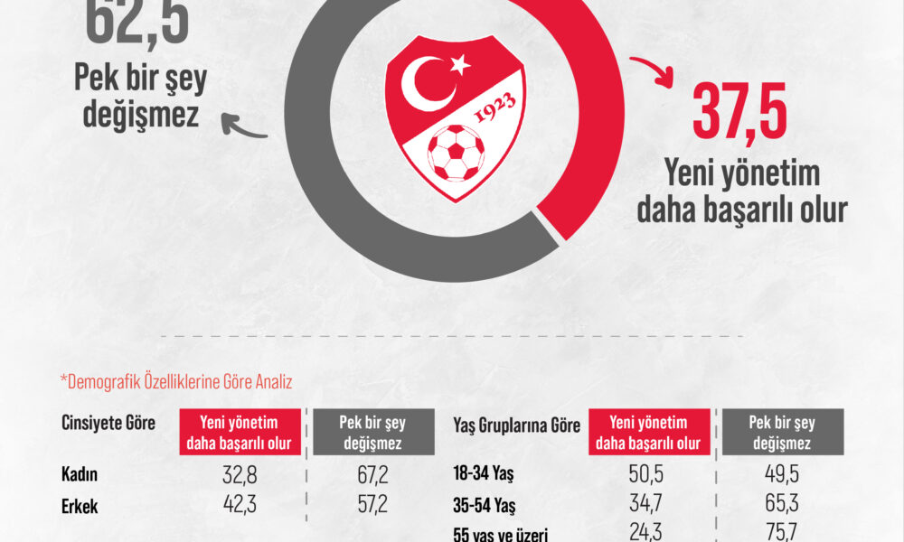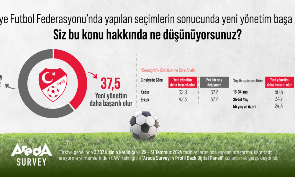 18 Temmuz’da Türkiye Futbol Federasyonu Olağan Mali ve Seçimli Genel Kurulu gerçekleşmiş ve Mehmet Büyükekşinin yerine İbrahim Kocaosmanoğlu yeni TFF Başkanı olarak seçilmişti. Araştırma Şirketi Areda Survey, Türkiye Futbol Federasyonu (TFF) yönetiminde yaşanan bu değişimi halka sordu. Araştırma sonuçlarına göre, halkın yüzde 62,5’i yeni yönetimin önemli bir değişiklik yaratmayacağı görüşündeyken, yüzde 37,5’i ise yeni yönetimin daha başarılı olacağını düşünüyor.