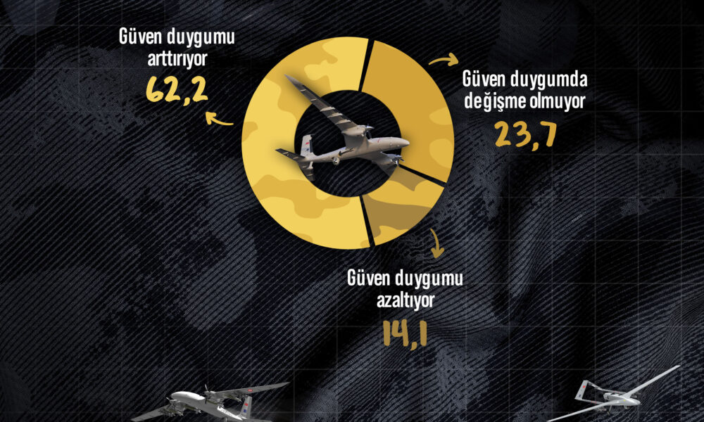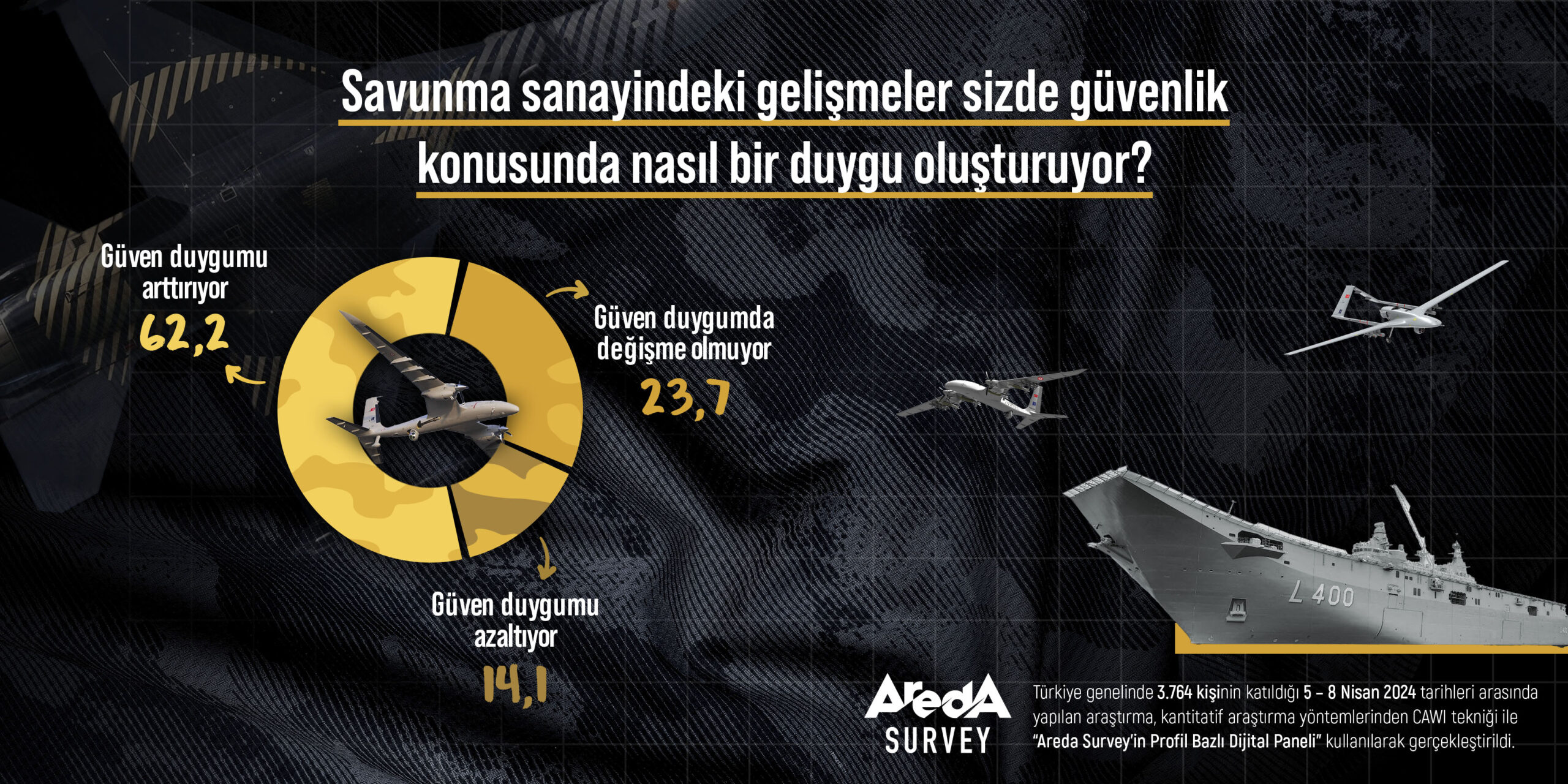 Türkiye, son yıllarda savunma sanayi alanına dair atılan adımlarla yerli üretim ve teknoloji ön plana çıkıyor. Areda Survey araştırma şirketinin gerçekleştirdiği araştırmaya göre savunma sanayi alanındaki gelişmeler karşısında güven duygusunun arttığını belirtenler toplumun yüzde 62,2’sini oluşturuyor. Güven duygusunda herhangi bir değişikliğin olmadığını belirtenlerin oranı yüzde 23,7 iken, katılımcıların yüzde 14,1’i güven duygusunun azaldığını belirtiyor.
