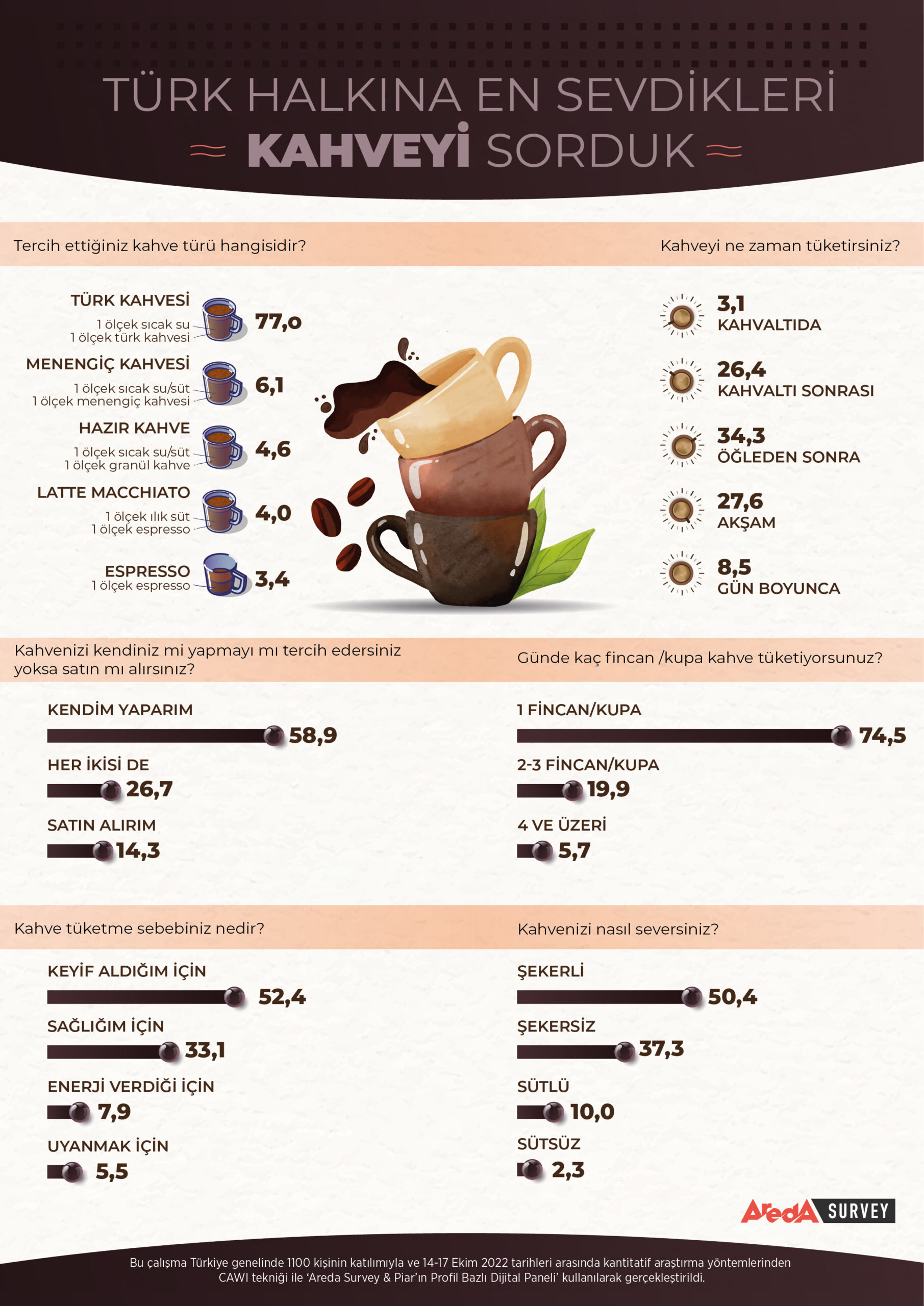 Günümüzde yeni nesil kahve tüketiminin giderek yaygınlaşmasıyla Türk toplumunun kahve tercihi de merak konusu haline geldi. Areda Survey’in gerçekleştirdiği en sevilen kahve araştırmasına göre yüzde 77,0 ile Türk kahvesi diğer kahve türlerini gölgede bıraktı.