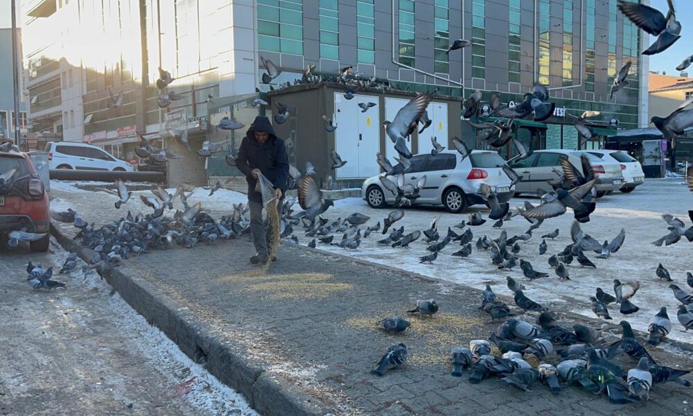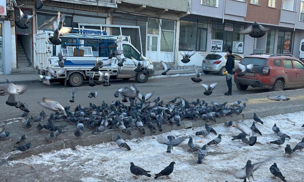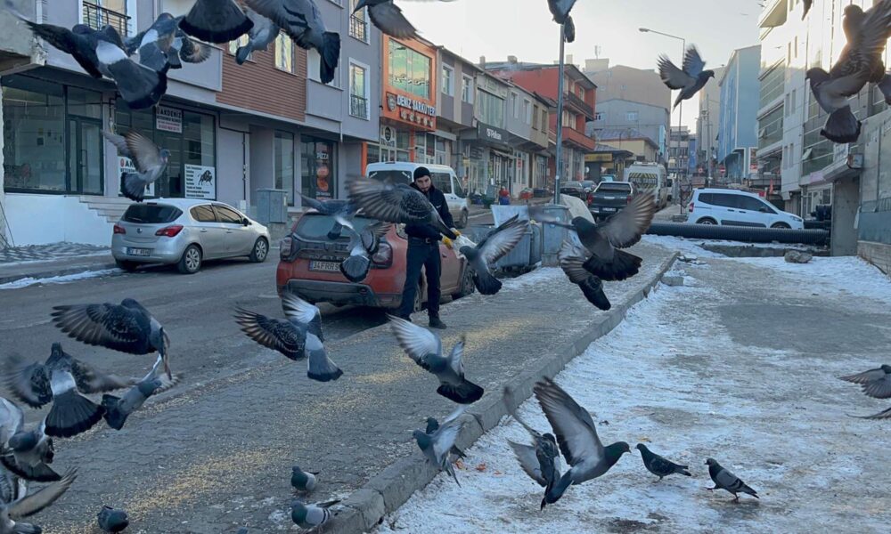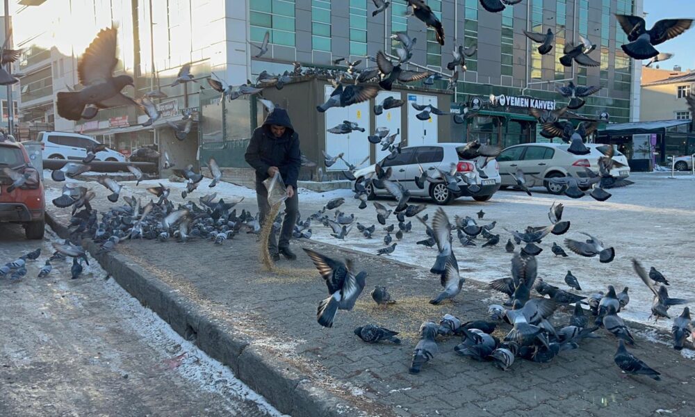 Ardahan’da esnaf soğuk havada yiyecek bulamayan güvercinleri imece usulü besliyor