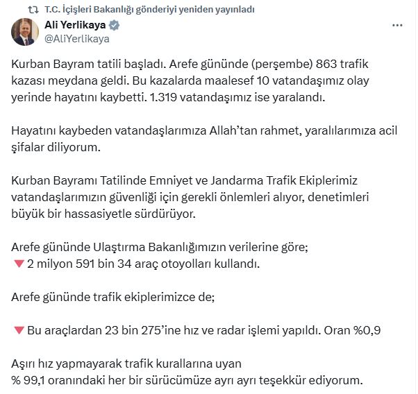 İçişleri Bakanı Ali Yerlikaya, Kurban Bayramı arifesinde kara yollarında meydana gelen kazalara ilişkin sosyal medya hesabından açıklama yaptı. Bakan Yerlikaya, “Kurban Bayram tatili başladı. Arife gününde 863 trafik kazası meydana geldi. Bu kazalarda maalesef 10 vatandaşımız olay yerinde hayatını kaybetti, 1319 vatandaşımız ise yaralandı. Hayatını kaybeden vatandaşlarımıza Allahtan rahmet, yaralılarımıza acil şifalar diliyorum” ifadelerini kullandı.