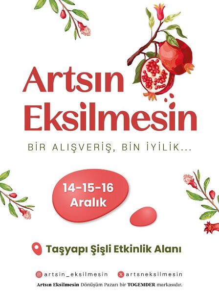 14-15-16 Aralık tarihlerinde TAŞYAPI Şişli Etkinlik Alanı’nda bu yıl üçüncüsü gerçekleştirilecek etkinlikte; mobilyadan kıyafete, ayakkabıdan aksesuara, ev eşyasından elektroniğe kadar markaların bağışladığı pek çok yeni ürün daha uygun fiyatlarla satışa sunulacak. Her eşyanın, her emeğin, her hikayenin bereketin simgesi nar taneleri gibi çoğalarak iyiliğe dönüşeceği etkinlikte; dernek tarafından yenilenen mobilyalar, sıfır atık ürünleri ve ikinci el eşyalar da sürdürülebilir yaşam farkındalığını artırmak amacıyla ziyaretçilerle buluşacak.