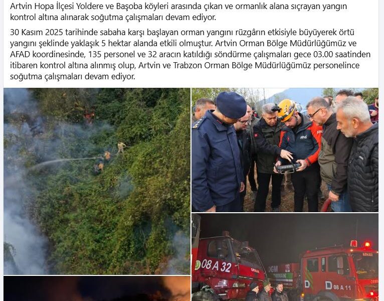 Artvin Orman Bölge Müdürlüğü’nün sosyal medya hesabından yapılan açıklamada, yangınının yaklaşık 5 hektarda etkili olduğu belirtildi. Orman Bölge Müdürlüğü ve AFAD koordinesinde, 135 personel ve 32 aracın katıldığı çalışmalar sonucu yangının kontrol altına alındığı vurgulanan açıklamada, Artvin ve Trabzon Orman Bölge Müdürlüğü personelince soğutma çalışmalarına devam edildiği belirtildi.