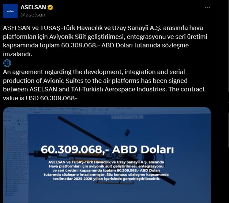 ASELSANın sosyal medya hesabından yapılan açıklamada, “ASELSAN ve TUSAŞ arasında, hava platformları için Aviyonik Süit geliştirilmesi, entegrasyonu ve seri üretimi kapsamında toplam 60 bin 309 ABD doları tutarında sözleşme imzalandı. Söz konusu teslimatlar 2025-2028 yılları içerisinde gerçekleştirilecektir” denildi.