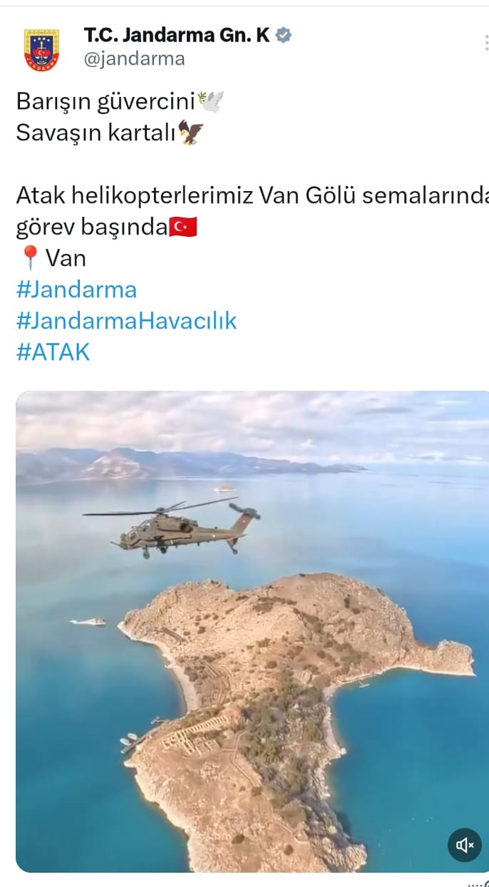Jandarma Atak helikopterlerinin görev sırasında Van Gölü üzerinde kaydedilen görüntü ve fotoğraflar, Jandarma Genel Komutanlığına ait sosyal medya hesabında paylaşıldı. Van Gölü ve göl içerisindeki Akdamar Adasının yer aldığı görsellerin üzerine Barışın güvercini, savaşın kartalı Atak helikopterlerimiz Van Gölü semalarında görev başında ifadelerine yer verildi. Paylaşılan video, sosyal medya kullanıcıları tarafından binlerce kez izlendi. 2 Atak helikopteri Van Gölü üzerindeyken, diğer helikopterin kamerasına yansıyan Van Gölünün masmavi suları içerisindeki Akdamar Adası ile Edremit ilçesinin güzel görüntüleri, kullanıcıların beğenisini topladı.