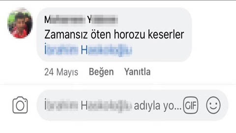 Şikayetçi İ.H.H.’nin avukatı Taha Yasin Caner, müvekkilinin paylaştığı habere Zamansız öten horozu keserler’ yorumu yapıldığını belirterek “Müvekkilimizin esasında normal bir haber paylaştığını görmekteyiz ve bu haberde de aslında hiç kimseye dokunmayacak, hiç kimseyi şahsi veya maddi-manevi şekilde zedelemeyecek bir haber paylaşmış. Ancak bazen vatandaşlarımız bu konuda kendilerini tutamayıp, bu şekilde yorumlar yazabiliyorlar. Bu söz konusu yorum ise aslında bir atasözü, işin en ilginç tarafı bu. ‘Zamansız öten horozu keserler’ diyerek ve müvekkilimizi de etiketlemek suretiyle müvekkilimize matuf bir şekilde bu yorumu yaptılar. Biz bunu müvekkilimize yönelik vücut bütünlüğüne tehdit olarak algıladık ve bunun üzerine savcılığa suç duyurusunda bulunduk. Mahkeme de ‘Zamansız öten horozu keserler’ atasözünü müvekkile yönelik bir tehdit olarak değerlendirdi” dedi.