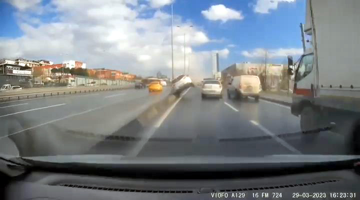 Kaza, dün saat 16.00 sıralarında D-100 Karayolu yan yolda meydana geldi. Küçükçekmece yönünde seyir halinde bulunan otomobil, Ambarlı yol ayrımında hatalı sollama yapan sürücünün kullandığı otomobil tarafından sıkıştırıldı. Bir anda hatalı sollama yapan otomobili önünde bulan araç sürücüsü, refüje vurduktan sonra elektrik direğine çarptı. Hatalı sollama yapan otomobilden inen sürücü kazanın şaşkınlığını yaşarken, diğer sürücüye çevredekiler yardıma koştu. Şans eseri ölen ya da yaralanan kişinin olmadığı kaza, arkadan gelen başka bir aracın araç kamerası ile kaydedildi.