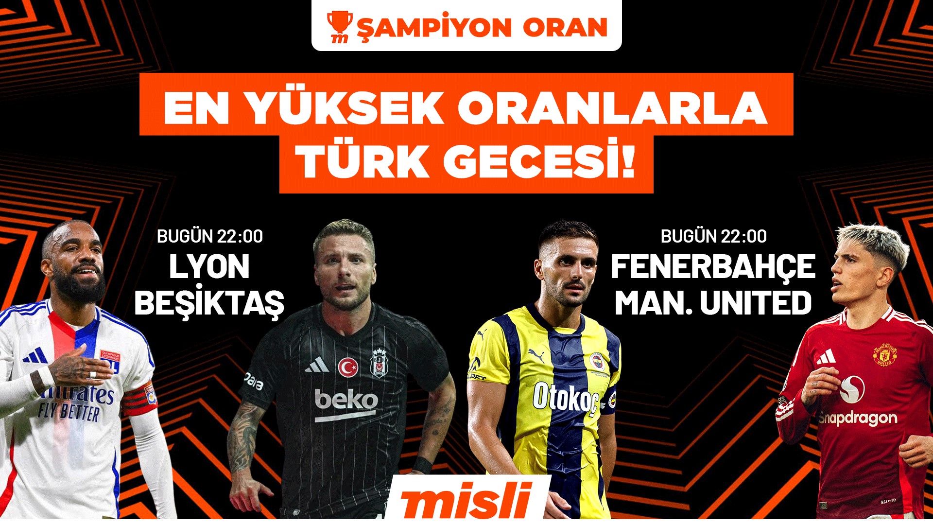 UEFA Avrupa Ligi temsilcilerimiz Fenerbahçe ve Beşiktaş bugün oynayacakları maçlarda futbolun dev isimleri ile karşılaşıyor. Fenerbahçe bugün saat 22.00’da UEFA Avrupa Ligi’nde İngiliz devi Manchester United’ı kendi evinde ağırlıyor. Beşiktaş da eş zamanlı olarak Fransız ekibi Lyon ile deplasmanda mücadele edecek. Temsilcilerimizin UEFA Avrupa Ligi heyecanı Misli’de ‘Şampiyon Oranlar’ ile daha da artıyor. Misli, temsilcilerimizin Avrupa maçlarında Türkiyenin en yüksek oranları ile fark yaratıyor.