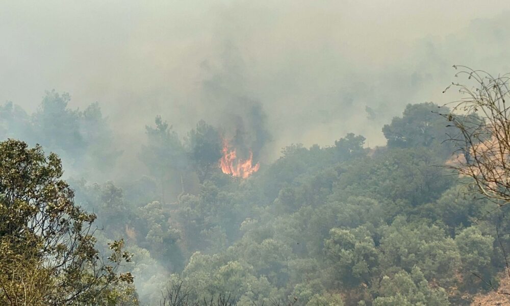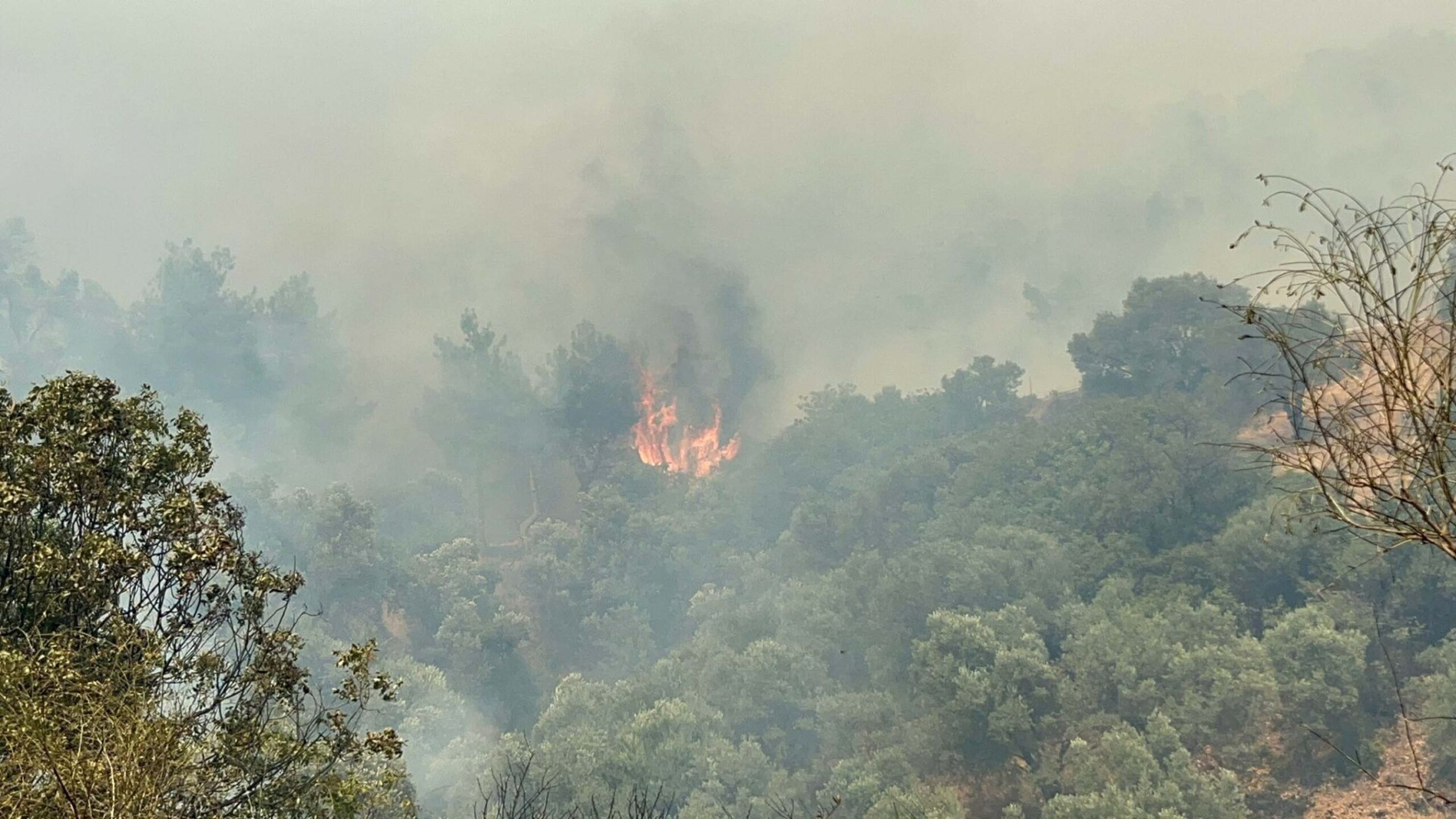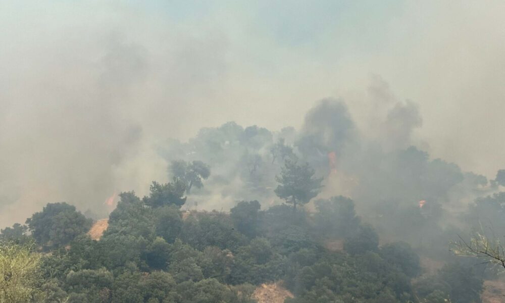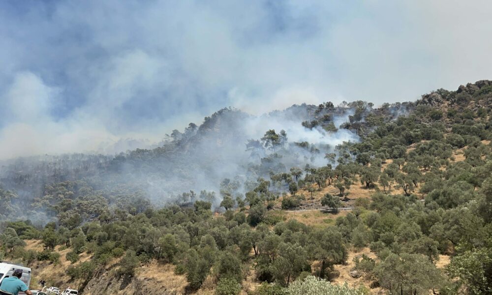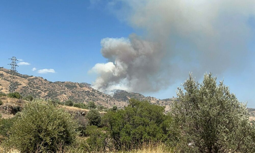 • Aydın'ın Efeler ilçesinde, tarım arazisinde çıkan yangın, ormana sıçradı. Alevlere, havadan ve karadan müdahale sürüyor. Fotoğraf: Aydın, (DHA)
