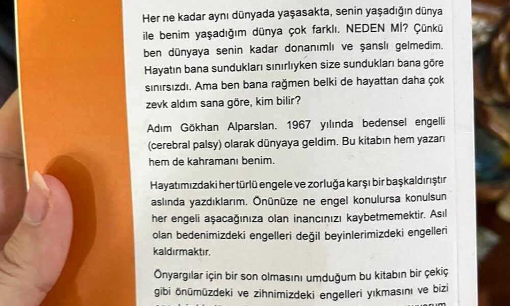 Alparslan, kitabın kapağında ise “Hayatımızdaki her türlü engele ve zorluğa karşı bir başkaldırıştır aslında yazdıklarım. Önünüze ne engel konulursa konulsun her engeli aşacağınıza olan inancınızı kaybetmemektir. Asıl olan bedenimizdeki engelleri değil beyinlerimizdeki engelleri kaldırmaktır. Önyargılar için bir son olmasını umduğum bu kitabın bir çekiç gibi önümüzdeki, zihnimizdeki engelleri yıkmasını ve bizi engelsiz bir dünya ile tanıştırmasına vesile olmasını umuyorum. Azmin zaferi sözde değil özde ve gerçek bir yaşam öyküsüdür” sözlerine yer verdi.