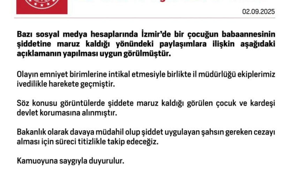 Aile ve Sosyal Hizmet Bakanlığı da konuya ilişkin açıklama yaptı. Açıklamada, “Bazı sosyal medya hesaplarında İzmirde bir çocuğun babaannesinin şiddetine maruz kaldığı yönündeki paylaşımlara ilişkin aşağıdaki açıklamanın yapılması uygun görülmüştür. Olayın emniyet birimlerine intikal etmesiyle birlikte il müdürlüğü ekiplerimiz ivedilikle harekete geçmiştir. Söz konusu görüntülerde şiddete maruz kaldığı görülen çocuk ve kardeşi devlet korumasına alınmıştır. Bakanlık olarak davaya müdahil olup şiddet uygulayan şahsın gereken cezayı alması için süreci titizlikle takip edeceğiz. Kamuoyuna saygıyla duyurulur” denildi.