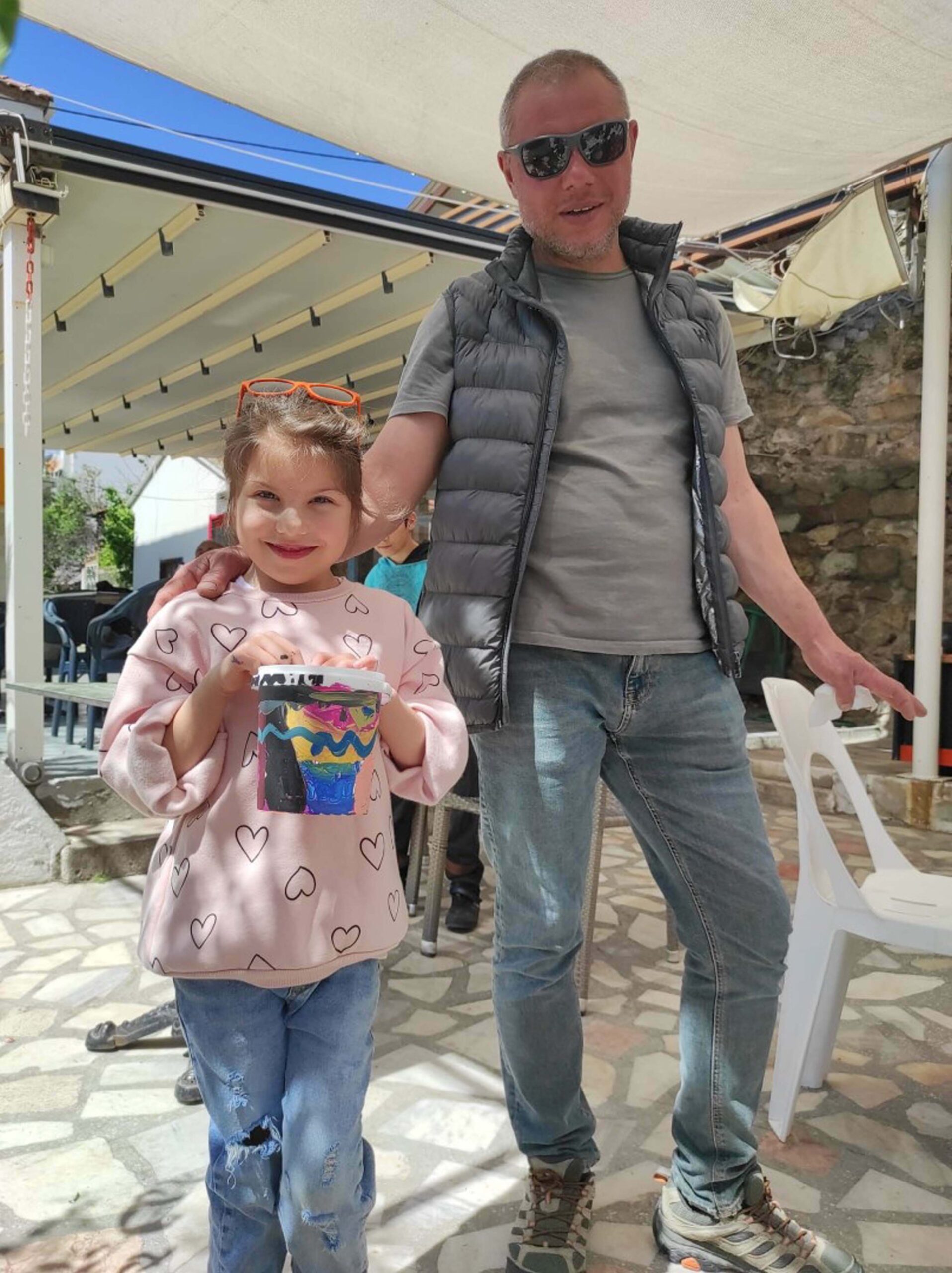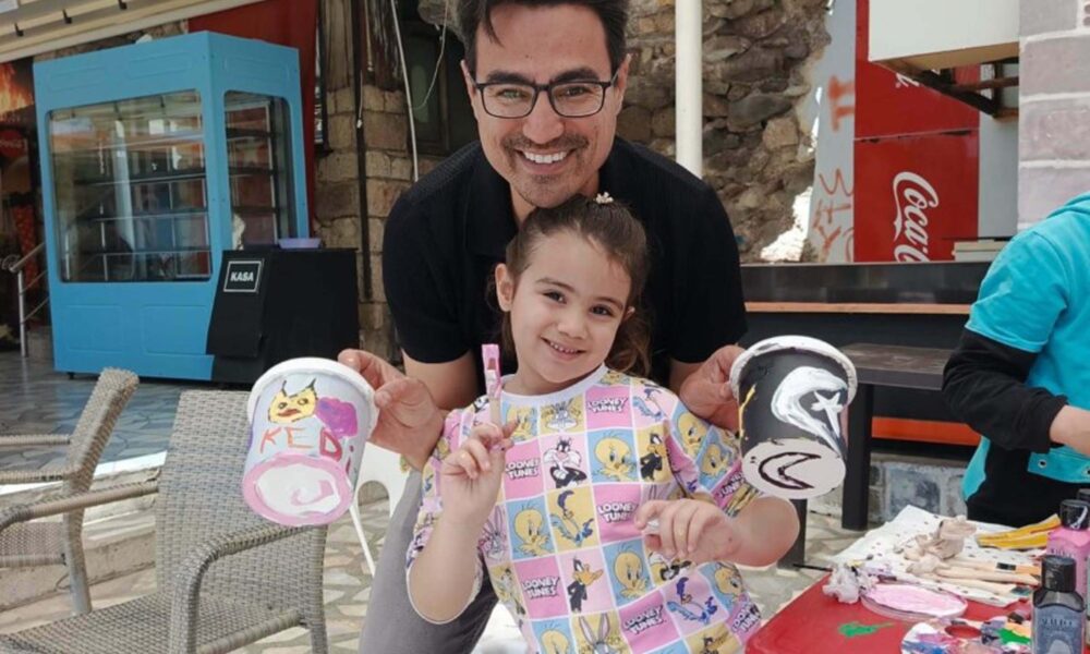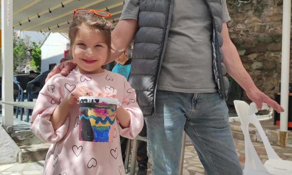 • İzmir'in Foça ilçesinde babalar ve çocukları, topladıkları atık plastik kapları boyayarak sokak hayvanları için su kaplarına dönüştürdü. Camilla Yakacak ile babası Kerem Yakacak. Fotoğraf: İzmir,(DHA)
