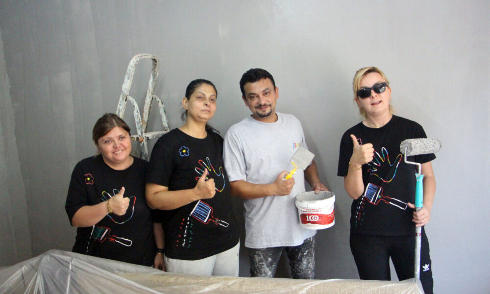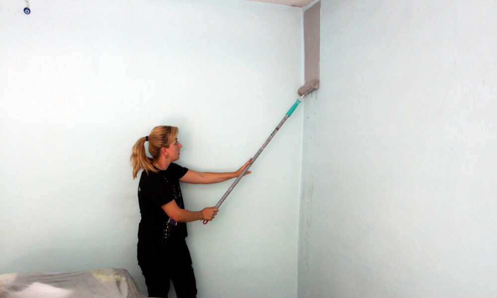 • Edirne'de ev hanımı Çiğdem Avga, internetten verdiği iş ilanıyla kurduğu 3 kadından oluşan ekiple, 15 yıllık badana ustası eşinin yanında çalışmaya başladı. Fotoğraf: Umut IŞIK/Edirne, (DHA)