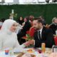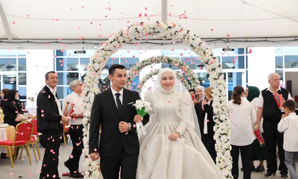 30’uncu Geleneksel Toplu Düğün Şöleninin yapıldığı Halk Sarayı, çiftlerin mutluluğuna ortak olmak isteyenlerle doldu. İlerleyen saatlerde gelin ve damatlar, müzik ve konfetiler eşliğinde alana girdi. Heyecanlı oldukları gözlenen çiftler, yoğun bir sevgi gösterisiyle karşılandı. Gelin ve damatların yerini almasının ardından nikah törenine geçildi.
