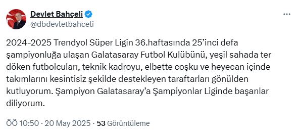 MHP Genel Başkanı Bahçeli, sosyal medya hesabından yaptığı açıklamada, “2024-2025 Trendyol Süper Ligin 36ncı haftasında 25inci defa şampiyonluğa ulaşan Galatasaray Futbol Kulübünü, yeşil sahada ter döken futbolcuları, teknik kadroyu, elbette coşku ve heyecan içinde takımlarını kesintisiz şekilde destekleyen taraftarları gönülden kutluyorum. Şampiyon Galatasaraya, Şampiyonlar Liginde başarılar diliyorum” ifadelerini kullandı.