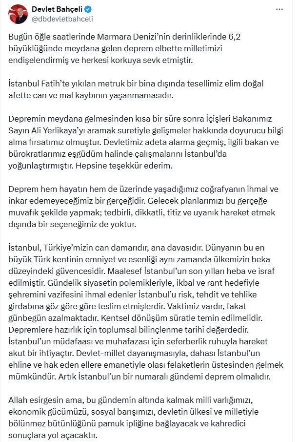 MHP Genel Başkanı Devlet Bahçeli, sosyal medya hesabından İstanbul’da meydana gelen depreme ilişkin açıklamada bulundu. Öğle saatlerinde Marmara Denizi’nin derinliklerinde 6,2 büyüklüğünde meydana gelen depremin milleti endişelendirdiğini ve herkesi korkuya sevk ettiğini kaydeden Bahçeli, “İstanbul Fatih’te yıkılan metruk bir bina dışında tesellimiz elim doğal afette can ve mal kaybının yaşanmamasıdır. Depremin meydana gelmesinden kısa bir süre sonra İçişleri Bakanımız Sayın Ali Yerlikaya’yı aramak suretiyle gelişmeler hakkında doyurucu bilgi alma fırsatımız olmuştur. Devletimiz adeta alarma geçmiş, ilgili bakan ve bürokratlarımız eşgüdüm halinde çalışmalarını İstanbul’da yoğunlaştırmıştır. Hepsine teşekkür ederim” ifadelerini kullandı.