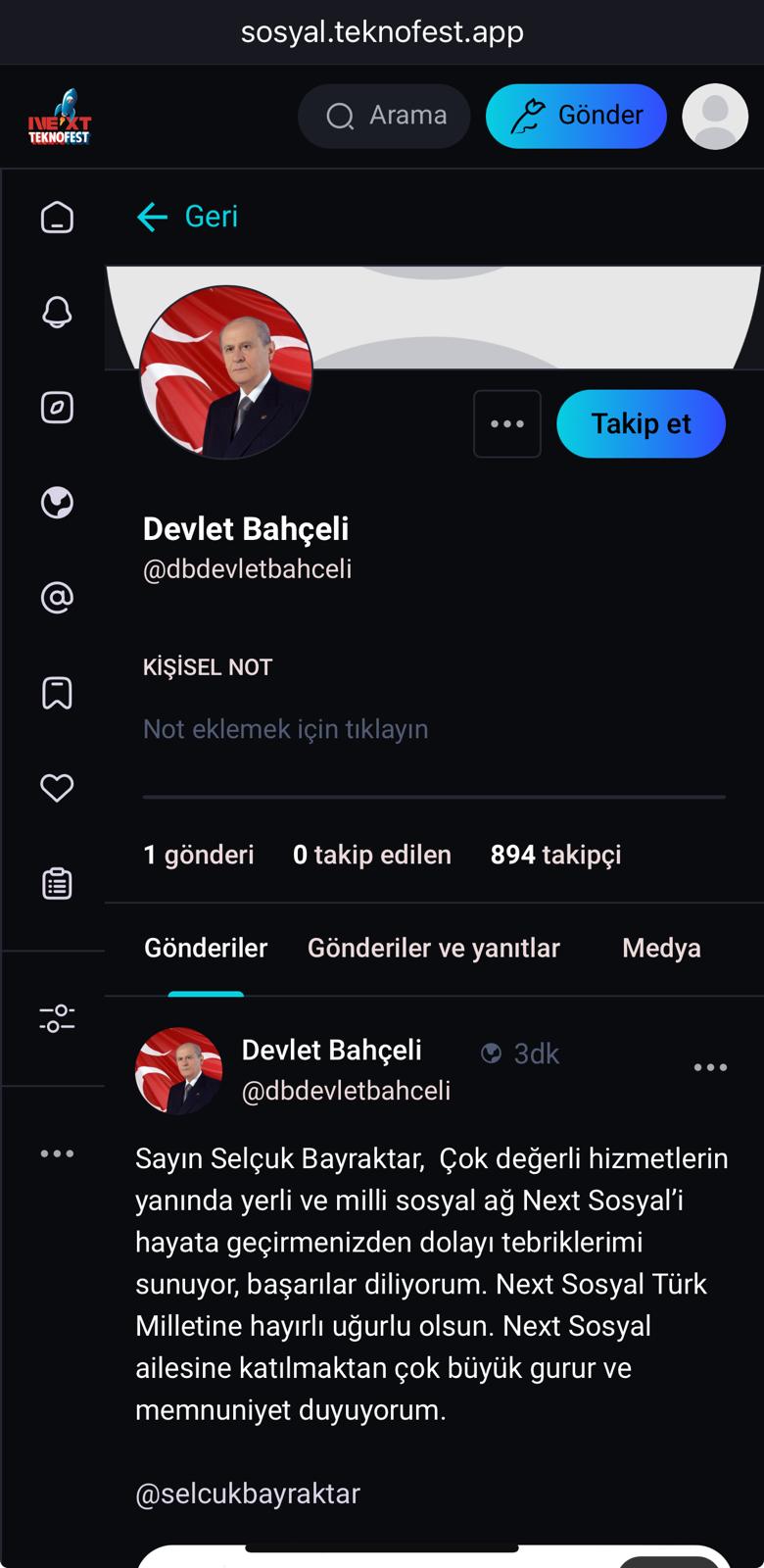 Davet üzerine Next Sosyal ailesine dahil olan Bahçeli, yerli sosyal medya platformundaki ilk paylaşımında, “Sayın Selçuk Bayraktar, çok değerli hizmetlerin yanında yerli ve milli sosyal ağ Next Sosyali hayata geçirmenizden dolayı tebriklerimi sunuyor, başarılar diliyorum. Next Sosyal, Türk milletine hayırlı uğurlu olsun. Next Sosyal ailesine katılmaktan çok büyük gurur ve memnuniyet duyuyorum” dedi.