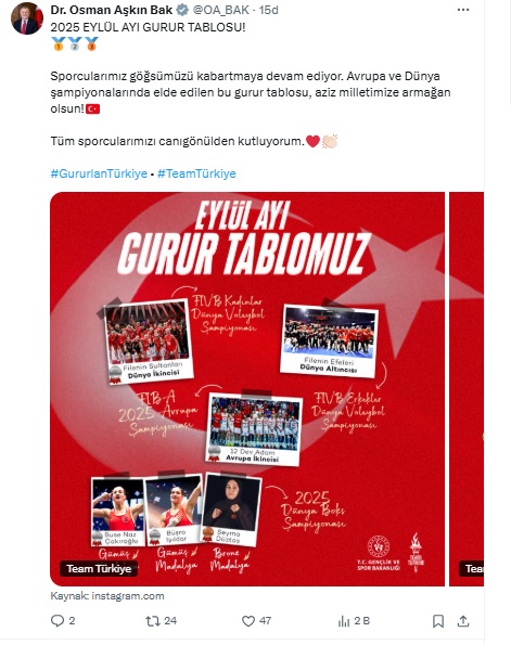 Milli sporcular, eylül ayında uluslararası organizasyonlarda takımlar ve ferdi müsabakalarda önemli başarılar kazandı. Gençlik ve Spor Bakanı Osman Aşkın Bak, sosyal medya hesaplarından, Türk sporunda eylül ayında alınan başarı tablosunu paylaştı. Bakan Bak, ‘Eylül ayı gurur tablomuz’ başlığı altında yaptığı paylaşımda, milli sporcuların kazandığı başarıların bulunduğu görsellere yer verdi. Bakan Bak, olimpik ve paralimpik branşlarda mücadele eden milli sporcuların, eylül ayında başarılı sonuçlar aldığını vurgulayarak, “Sporcularımız göğsümüzü kabartmaya devam ediyor. Avrupa ve Dünya şampiyonalarında elde edilen bu gurur tablosu, aziz milletimize armağan olsun. Tüm sporcularımızı canıgönülden kutluyorum” değerlendirmesinde bulundu.
