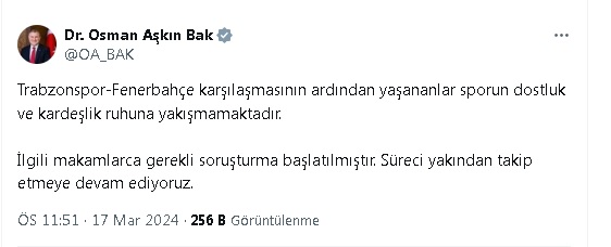 Gençlik ve Spor Bakanı Osman Aşkın Bak, Trabzonspor-Fenerbahçe maçı ardından yaşanan olaylara ilişkin açıklama yaptı.Gençlik ve Spor Bakanı Bak, sosyal medya hesabından yaptığı paylaşımda, “Trabzonspor-Fenerbahçe karşılaşmasının ardından yaşananlar, sporun dostluk ve kardeşlik ruhuna yakışmamaktadır. İlgili makamlarca gerekli soruşturma başlatılmıştır. Süreci yakından takip etmeye devam ediyoruz” dedi.