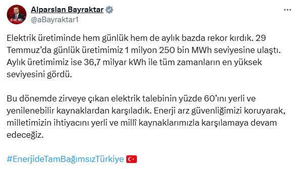Enerji ve Tabii Kaynaklar Bakanı Alparslan Bayraktar, sosyal medya hesabından yaptığı açıklamada, “Elektrik üretiminde hem günlük hem de aylık bazda rekor kırdık. 29 Temmuzda günlük üretimimiz 1 milyon 250 bin megavat saat seviyesine ulaştı. Aylık üretimimiz ise 36,7 milyar kilovatsaat ile tüm zamanların en yüksek seviyesini gördü. Bu dönemde zirveye çıkan elektrik talebinin yüzde 60ını yerli ve yenilenebilir kaynaklardan karşıladık. Enerji arz güvenliğimizi koruyarak, milletimizin ihtiyacını yerli ve milli kaynaklarımızla karşılamaya devam edeceğiz” dedi.