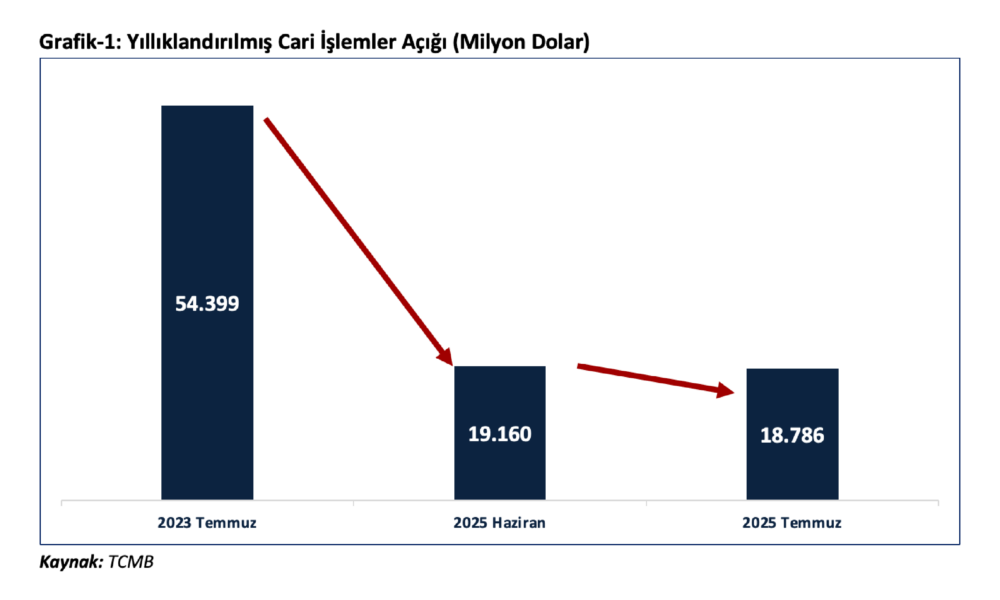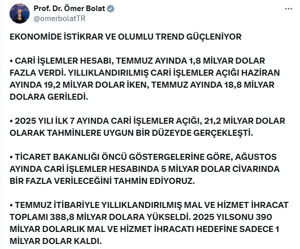 Ticaret Bakanı Ömer Bolat, temmuz ayı ödemeler dengesi istatistiklerine ilişkin sosyal medya hesabından açıklama yaptı. Bakan Bolat, ekonomide istikrar ve olumlu trendin güçlendiğini belirterek, “Cari işlemler hesabı, temmuz ayında 1,8 milyar dolar fazla verdi. Yıllıklandırılmış cari işlemler açığı haziran ayında 19,2 milyar dolar iken, temmuz ayında 18,8 milyar dolara geriledi. 2025 yılı ilk 7 ayında cari işlemler açığı, 21,2 milyar dolar olarak tahminlere uygun bir düzeyde gerçekleşti. Ticaret Bakanlığı öncü göstergelerine göre, ağustos ayında cari işlemler hesabında 5 milyar dolar civarında bir fazla verileceğini tahmin ediyoruz” dedi.