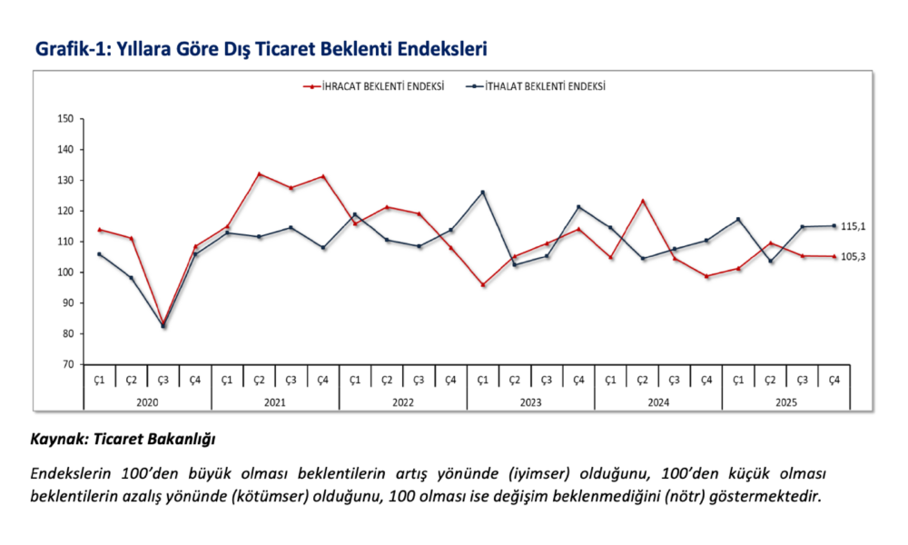 Ticaret Bakanı Ömer Bolat, anket sonuçlarına ilişkin NSosyal hesabından yaptığı açıklamada, “2025 yılı dördüncü çeyrek ihracat beklenti endeksi 105,3 seviyesinde gerçekleşerek ihracata yönelik beklentilerin artış yönünde olduğuna işaret etti. 1-17 Eylül 2025 tarihleri arasında uygulanan Dış Ticaret Beklenti Anketi sonuçlarına göre, 2025 yılı dördüncü çeyrek ihracat beklenti endeksi bir önceki çeyreğe göre 0,2 puan azalarak 105,3 oldu. Endeksin 100ün üzerinde olması ihracata yönelik beklentilerin artış yönünde (iyimser) olduğunu göstermektedir. Dördüncü çeyrekte bir önceki çeyreğe göre Avrupaya (6,2 puan), Türk cumhuriyetlerine (1,6 puan), Afrikaya (1,6 puan) ve Orta Doğuya (1,4 puan) ihracatta artış bekleyenlerin lehine olan durum güçlenerek devam etmiştir. Önümüzdeki üç aylık dönemde ihracatçı firmaların ilk kez ihracat yapmayı planladıkları ülkeler arasında ABD ilk sırada yer alırken, Mısır ikinci sırada, Meksika ise üçüncü sırada yer almıştır” ifadelerini kullandı.