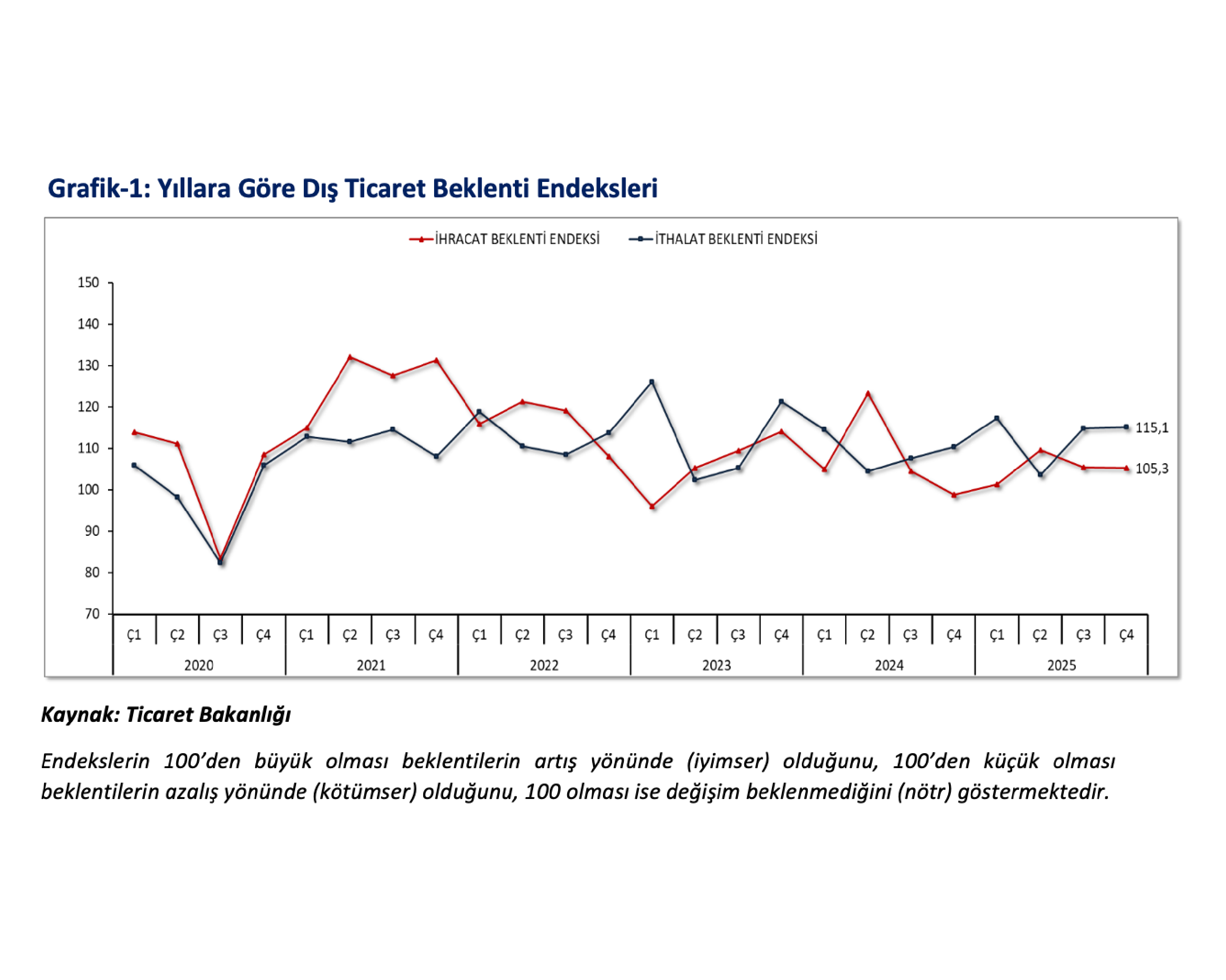 Ticaret Bakanlığı, yılın son çeyreğine ilişkin Dış Ticaret Beklenti Anketini açıkladı. Buna göre; ihracat beklenti endeksi bir önceki çeyreğe göre 0,2 puan azaldı. Üçüncü çeyrekte 105,5 seviyesinde olan endeks, son çeyrekte 105,3e geriledi. Endeks, geçen yılın aynı dönemine göre ise 6,4 puan arttı.