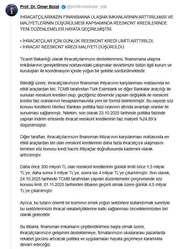 Türkiye Cumhuriyet Merkez Bankası (TCMB), reeskont kredilerinin günlük limitinin 1 Kasım itibariyle geçerli olmak üzere 4,5 milyar TLye çıkarılmasına karar verdi. Ticaret Bakanı Ömer Bolat, TCMBnin düzenlemesine ilişkin NSosyal hesabından açıklama yaptı. Bakan Bolat, “Ticaret Bakanlığı olarak ihracatçılarımızın desteklenmesi, finansmana ulaşma imkanlarının genişletilmesi noktasındaki çalışmalar devletimizin bütün ilgili kurum ve kuruluşları ile koordinasyon içinde yoğun bir şekilde sürdürülmektedir. Bilindiği üzere, ihracatçılarımızın finansman ihtiyacının karşılanması noktasında en etkili araçlardan biri, TCMB tarafından Türk Eximbank ve diğer bankalar aracılığı ile sunulan reeskont kredileri olup, geçtiğimiz dönemde yapılan değişiklik ile reeskont kredisi faiz oranlarının hesaplanmasında yeni bir formül belirlenmiştir. Bu sayede söz konusu kredilerin Merkez Bankası politika faizi oranının altında avantajlı oranlar ile sunulması sağlanmıştı. Nitekim, son olarak 23 Ekim 2025 tarihinde politika faizinde yapılan indirim ertesinde ihracat reeskont kredilerinin faiz maliyeti yüzde 24,89a düşürülmüştür. Diğer taraftan, ihracatçılarımızın finansman ihtiyacının karşılanması noktasında en etkili araçlardan biri olan reeskont kredilerinin daha fazla ihracatçıya ulaşmasını teminen söz konusu kredi hacmi ihtiyaçlar doğrultusunda kademeli olarak arttırılmıştır” ifadelerini kullandı.