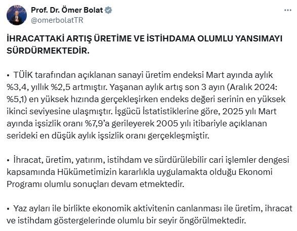 Ticaret Bakanı Ömer Bolat, sanayi üretimi verilerine ilişkin sosyal medya hesabından yaptığı açıklamada, “İhracattaki artış üretime ve istihdama olumlu yansımayı sürdürmektedir. TÜİK tarafından açıklanan sanayi üretim endeksi, mart ayında aylık yüzde 3,4, yıllık yüzde 2,5 artmıştır. Yaşanan aylık artış son 3 ayın (Aralık 2024: yüzde 5,1) en yüksek hızında gerçekleşirken, endeks değeri serinin en yüksek ikinci seviyesine ulaşmıştır. İş gücü istatistiklerine göre, 2025 yılı Mart ayında işsizlik oranı yüzde 7,9a gerileyerek 2005 yılı itibarıyla açıklanan serideki en düşük aylık işsizlik oranı gerçekleşmiştir. İhracat, üretim, yatırım, istihdam ve sürdürülebilir cari işlemler dengesi kapsamında hükümetimizin kararlıkla uygulamakta olduğu ekonomi programının olumlu sonuçları devam etmektedir. Yaz ayları ile birlikte ekonomik aktivitenin canlanması ile üretim, ihracat ve istihdam göstergelerinde olumlu bir seyir öngörülmektedir” dedi.