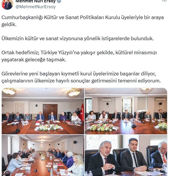 Bakan Ersoy, sosyal medya hesabından yaptığı açıklamada, Cumhurbaşkanlığı Kültür ve Sanat Politikaları Kurulu üyeleriyle bir araya geldiklerini belirterek, “Ülkemizin kültür ve sanat vizyonuna yönelik istişarelerde bulunduk. Ortak hedefimiz; Türkiye Yüzyılı’na yakışır şekilde, kültürel mirasımızı yaşatarak geleceğe taşımak. Görevlerine yeni başlayan kıymetli kurul üyelerimize başarılar diliyor, çalışmalarının ülkemize hayırlı sonuçlar getirmesini temenni ediyorum” ifadelerini kullandı.