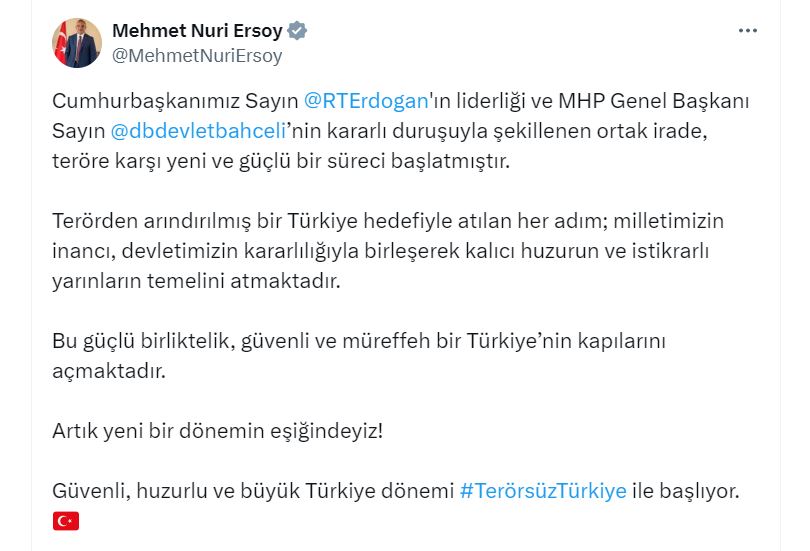 Bakan Ersoy, sosyal medya hesabından yaptığı açıklamada, “Cumhurbaşkanımız Sayın Recep Tayyip Erdoğanın liderliği ve MHP Genel Başkanı Sayın Devlet Bahçelinin kararlı duruşuyla şekillenen ortak irade, teröre karşı yeni ve güçlü bir süreci başlatmıştır. Terörden arındırılmış bir Türkiye hedefiyle atılan her adım; milletimizin inancı, devletimizin kararlılığıyla birleşerek kalıcı huzurun ve istikrarlı yarınların temelini atmaktadır. Bu güçlü birliktelik, güvenli ve müreffeh bir Türkiyenin kapılarını açmaktadır. Artık yeni bir dönemin eşiğindeyiz. Güvenli, huzurlu ve büyük Türkiye dönemi Terörsüz Türkiye ile başlıyor” ifadelerini kullandı.