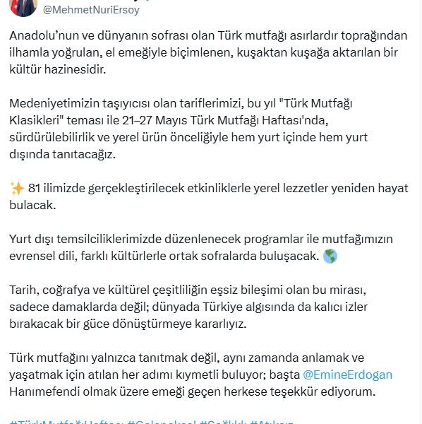 Kültür ve Turizm Bakanı Mehmet Nuri Ersoy, Türk Mutfağı Haftası ile ilgili sosyal medya hesabından yaptığı açıklamada, “Anadolunun ve dünyanın sofrası olan Türk mutfağı asırlardır toprağından ilhamla yoğrulan, el emeğiyle biçimlenen, kuşaktan kuşağa aktarılan bir kültür hazinesidir. Medeniyetimizin taşıyıcısı olan tariflerimizi, bu yıl Türk Mutfağı Klasikleri teması ile 21-27 Mayıs Türk Mutfağı Haftasında, sürdürülebilirlik ve yerel ürün önceliğiyle hem yurt içinde hem yurt dışında tanıtacağız. 81 ilimizde gerçekleştirilecek etkinliklerle yerel lezzetler yeniden hayat bulacak. Yurt dışı temsilciliklerimizde düzenlenecek programlar ile mutfağımızın evrensel dili, farklı kültürlerle ortak sofralarda buluşacak” ifadelerini kullandı.
