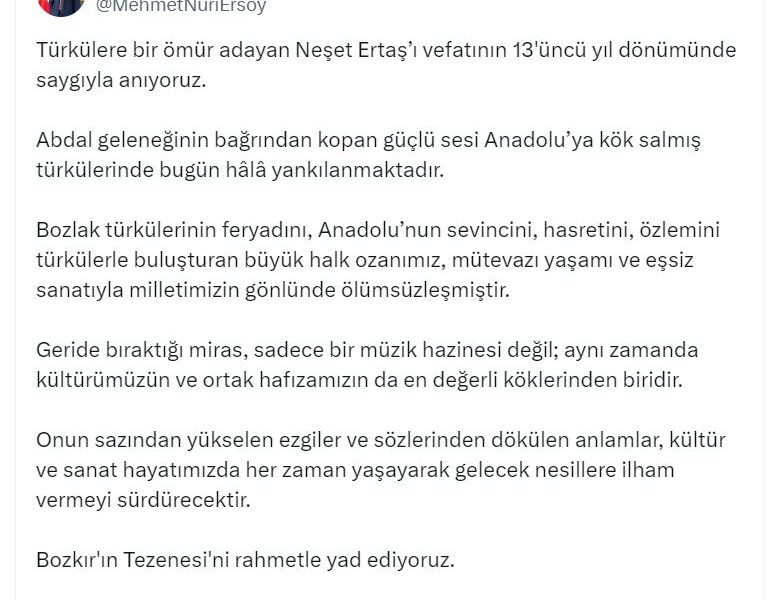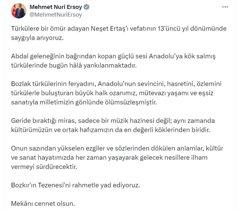 Bakan Ersoy, sosyal medya hesabından yayımladığı mesajda, “Türkülere bir ömür adayan Neşet Ertaşı vefatının 13üncü yıl dönümünde saygıyla anıyoruz. Abdal geleneğinin bağrından kopan güçlü sesi Anadoluya kök salmış türkülerinde bugün hala yankılanmaktadır. Bozlak türkülerinin feryadını, Anadolunun sevincini, hasretini, özlemini türkülerle buluşturan büyük halk ozanımız, mütevazı yaşamı ve eşsiz sanatıyla milletimizin gönlünde ölümsüzleşmiştir. Geride bıraktığı miras, sadece bir müzik hazinesi değil; aynı zamanda kültürümüzün ve ortak hafızamızın da en değerli köklerinden biridir. Onun sazından yükselen ezgiler ve sözlerinden dökülen anlamlar, kültür ve sanat hayatımızda her zaman yaşayarak gelecek nesillere ilham vermeyi sürdürecektir. Bozkırın Tezenesini rahmetle yad ediyoruz. Mekanı cennet olsun” ifadelerini kullandı.