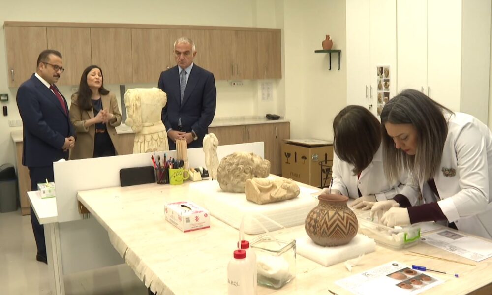 Bakan Ersoy, Konservasyon Laboratuvarında yürütülen çalışmaları yerinde inceledikten sonra yapılan çalışmalara ilişkin bilgi verdi. Bakanlık bünyesinde aktif 11 laboratuvar olduğunu kaydeden Ersoy, “281 personelle hizmet veriyoruz bu laboratuvarlarda. Kazıdan çıkan malzeme sergilenene kadar birçok kimyasal işlemden geçiyor. Bütün bu koruma çalışmaları, tümleme çalışmaları, restorasyon ve renovasyon çalışmaları hepsi burada gerçekleştiriliyor. Aynı şekilde kazı başkanlıklarından gelen hem tarihlerin tespiti hem de nasıl müdahale edileceği hangi malzemelerle müdahale edileceği gibi çalışmaların son kararları da bu laboratuvarlardan gelen sonuçlara göre yapılıyor. Son zamanlarda çok ciddi yatırım yaptık. Hem ekip hem ekipman konusunda ciddi takviyeler yaptık laboratuvarlara. 251 binden fazla eser kazandırıldı bu restorasyon laboratuvarlarında. Dünyadaki sayılı büyük laboratuvarlardan birine sahip ülkemiz. Birçok ülkenin eğitim görmek isteyen ekipleri de bizim ülkemizdeki laboratuvarlarda bu eğitimlerini alıyorlar. Türkiye bu açıdan çok ciddi bir yol aldı. Hızlı bir şekilde de geliştirmeye devam ediyoruz” ifadelerini kullandı.