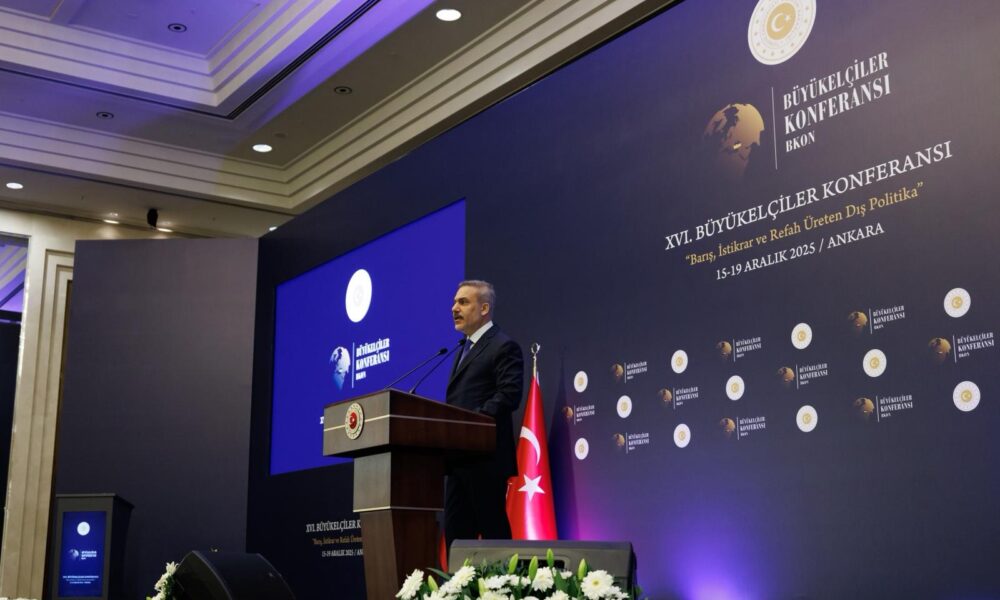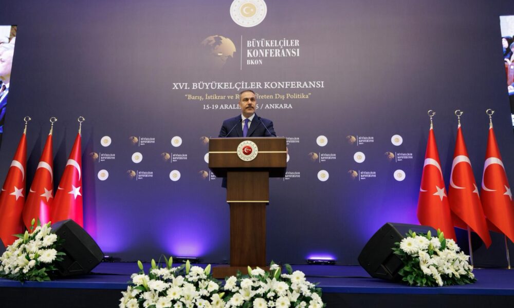 Bakan Fidan, Ankarada düzenlenen 16ıncı Büyükelçiler Konferansının açılışında konuştu. Fidan, bu yılki konferansın temasının Türkiyenin diplomasi hamleleri ve küresel yansımaları olarak belirlendiğini ifade ederek, “Uzak ve yakın tecrübelerimiz bize gösterdi ki sınamalar bitmiyor, bitmeyecektir. Ancak bir şeyden kesinlikle eminiz; güçlü Türk diplomasisi, derin birikimi ve her geçen gün daha da gelişmekte olan yetenekleriyle her türlü sınamanın altından başarıyla kalkacak kudrettedir. Şartlar ne olursa olsun vazifemiz bakidir; devletimizin ali menfaatlerini korumak ve uluslararası alanda hak ettiği yeri almasını sağlamak. Hatırlayacağınız üzere, geçtiğimiz yıl 15inci Büyükelçiler Konferansımızı Türkiyenin Diplomasi Hamleleri ve Küresel Yansımaları başlığı altında gerçekleştirmiştik. O günkü tespitimiz şuydu: Türkiye, krizler karşısında edilgen bir izleyici değil, stratejik hamleleriyle süreçleri şekillendiren bir aktördür. Nitekim, aradan geçen süre zarfında, sahada attığımız adımların, bölgesel ve küresel denklemde somut yansımalarını gördük; görmeye devam ediyoruz. Bu yılki temamız; Barış, İstikrar ve Refah Üreten Dış Politika. Bu tema, edilgenliği reddeden, uluslararası sistemin açıklarını kapatmaya talip, düzen kurucu dış politika anlayışımızın bir yansımasıdır. Zira, uluslararası sistemin tıkandığı ve çözüm mekanizmalarının felç olduğu bu ortamda, barışı, istikrarı ve refahı diplomatik araçlarımızla bizzat biz inşa etmek zorundayız. Bu inşa sürecinde en büyük dayanağımız, şüphesiz Hariciyemizin köklü kurumsal müktesebatı üzerine inşa ettiğimiz kapasite ve yeteneklerimizdir” ifadelerini kullandı.