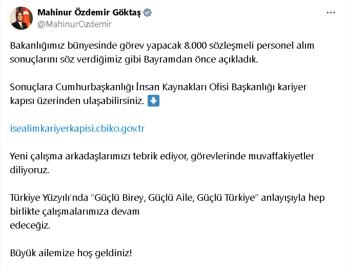 AİLE ve Sosyal Hizmetler Bakanı Mahinur Özdemir Göktaş, bakanlık bünyesinde görev yapacak 8 bin sözleşmeli personel alım sonuçlarının açıklandığını duyurdu.Bakan Göktaş, sosyal medya hesabından yaptığı açıklamada, “Bakanlığımız bünyesinde görev yapacak 8 bin sözleşmeli personel alım sonuçlarını söz verdiğimiz gibi bayramdan önce açıkladık. Sonuçlara Cumhurbaşkanlığı İnsan Kaynakları Ofisi Başkanlığı kariyer kapısı üzerinden ulaşabilirsiniz. Yeni çalışma arkadaşlarımızı tebrik ediyor, görevlerinde muvaffakiyetler diliyoruz. Türkiye Yüzyılında Güçlü Birey, Güçlü Aile, Güçlü Türkiye anlayışıyla hep birlikte çalışmalarımıza devam edeceğiz. Büyük ailemize hoş geldiniz” dedi.