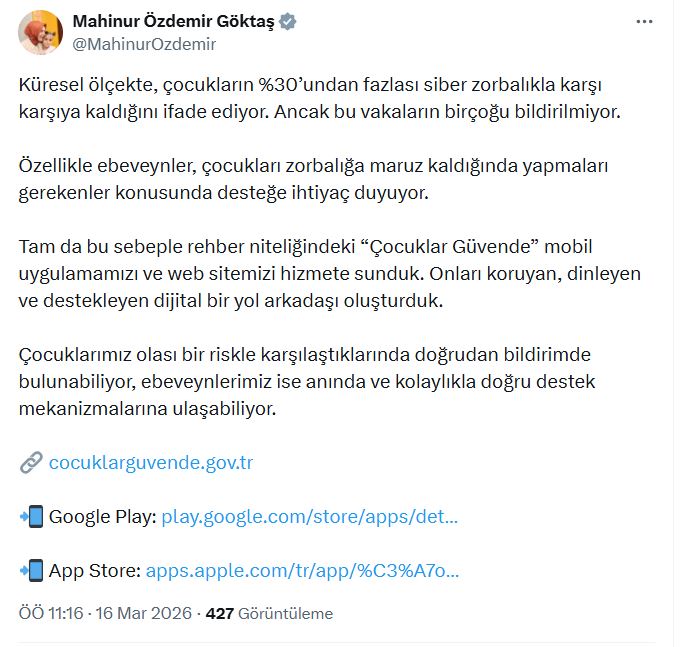 Aile ve Sosyal Hizmetler Bakanı Mahinur Özdemir Göktaş, sanal medya hesabından yaptığı açıklamada, “Küresel ölçekte, çocukların yüzde 30undan fazlası siber zorbalıkla karşı karşıya kaldığını ifade ediyor. Ancak bu vakaların birçoğu bildirilmiyor. Özellikle ebeveynler, çocukları zorbalığa maruz kaldığında yapmaları gerekenler konusunda desteğe ihtiyaç duyuyor. Tam da bu sebeple rehber niteliğindeki Çocuklar Güvende mobil uygulamamızı ve web sitemizi hizmete sunduk. Onları koruyan, dinleyen ve destekleyen dijital bir yol arkadaşı oluşturduk. Çocuklarımız olası bir riskle karşılaştıklarında doğrudan bildirimde bulunabiliyor, ebeveynlerimiz ise anında ve kolaylıkla doğru destek mekanizmalarına ulaşabiliyor” ifadelerini kullandı.